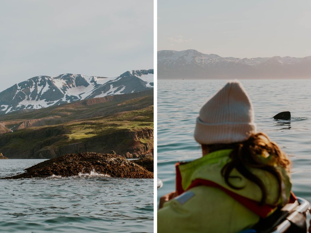 Dann war es Zeit für unseren letzten Programmpunkt des Tages: Eine Whale Watching Tour. Gemeinsam mit einigen anderen Nordic Nomads Reisenden brachen wir, bekleidet mit leuchtend gelb-roten Anzügen mit einem Speedboot auf eine 2-stündige Tour in Húsavik auf. Und schon nach wenigen Metern war uns das Glück hold. Denn wir bekamen einen 8 m langen Riesenhai zu Gesicht. Unsere Guides waren komplett aus dem Häuschen, denn normalerweise lassen sich diese hier nicht blicken. Der Riesenhai war sichtbar neugierig und schwamm eine Zeitlang um unser Boot herum und sogar einmal unten durch. Was für ein Erlebnis! Anschließend fuhren wir zur Papageieninsel, auf der sich Hunderte Papageientaucher tummelten, bevor wir uns auf die Suche machten nach Walen. Und auch hier wurden wir fündig: Zwei Buckelwale konnten wir, neben einem Seehund noch beobachten. Was für ein Tag!