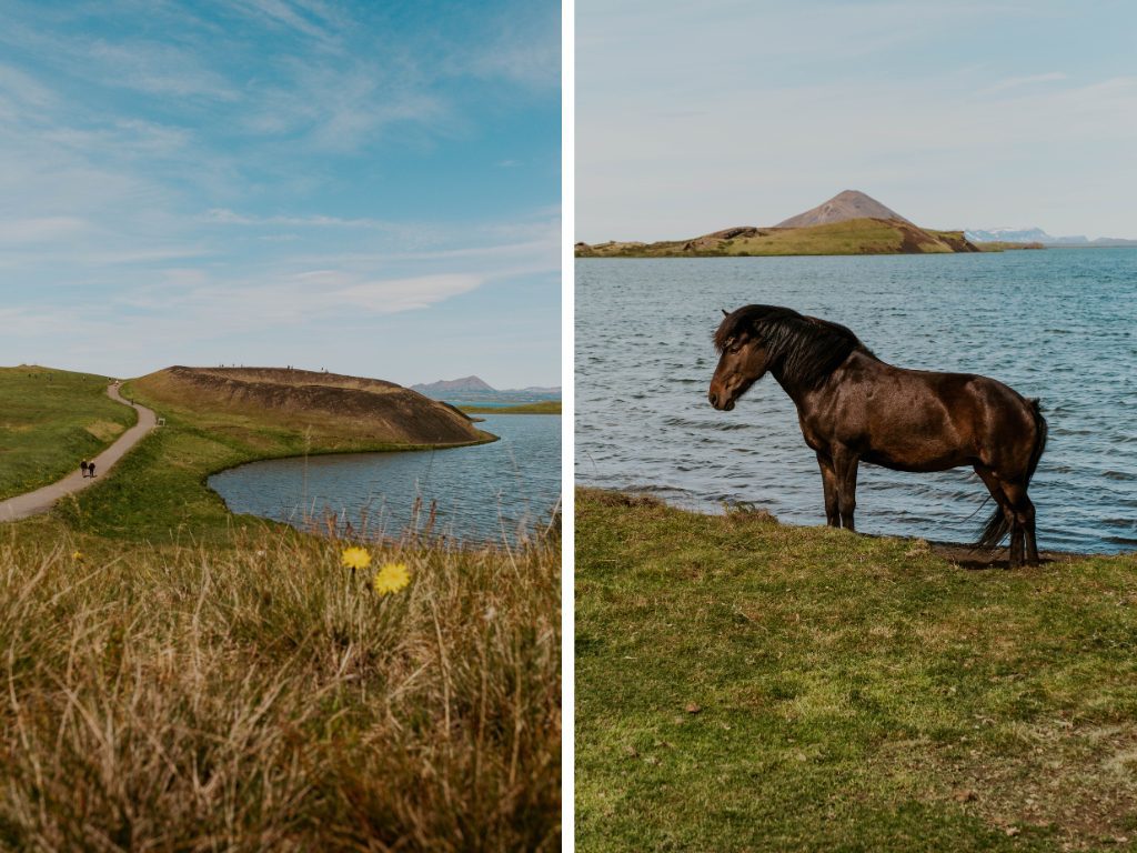 Unser nächster Stopp befindet sich genau auf dem Mittelatlantischen Rücken: die kleine, aber außergewöhnlich blaue Grjótagjá-Höhle, die bereits als Filmkulisse für Game of Thrones dienen durfte. Auf unbefestigten Straßen ging es zum beeindruckenden Hverfjall Krater, dessen Anblick den 20-minütigen Aufstieg mehr als wert war. Man kann auch einmal um den Krater herum wandern. Bei den Skútustaðir Kratern legten wir eine Mittagspause ein.