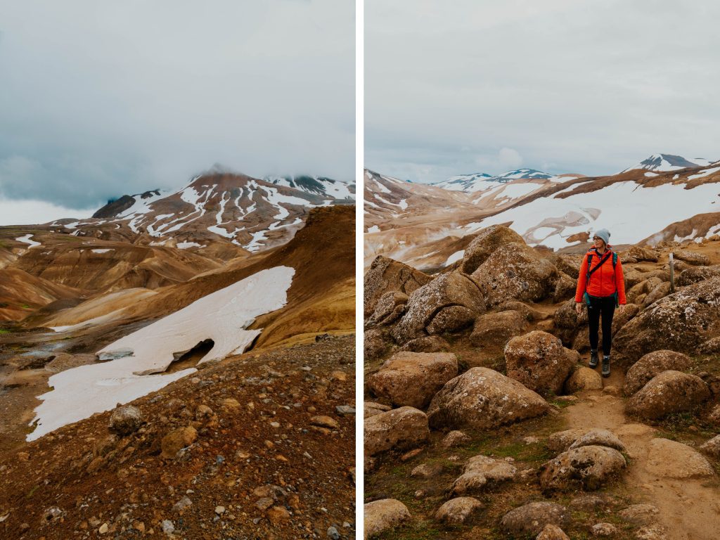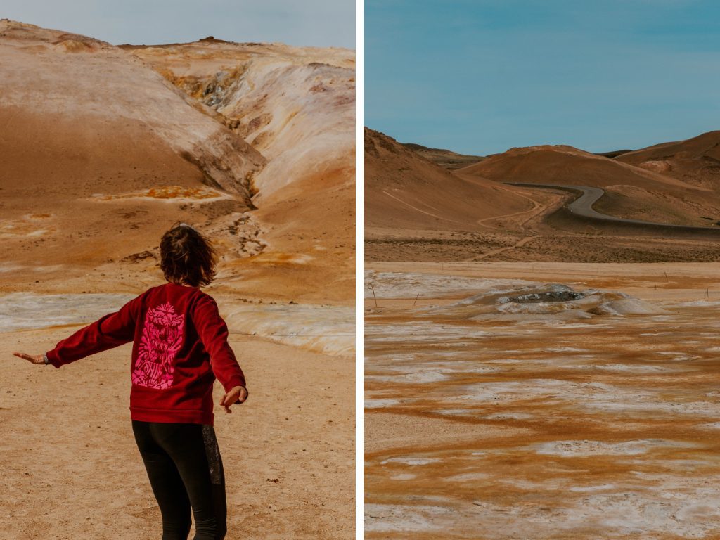 Während um uns herum die Landschaft immer spektakulärer wurde, näherten wir uns unserem Tageshighlight: dem Kerlingafjöll. Mit seinen Dämpfen und den spektakulären Farbabstufungen von Ockergelb bis hin zu blau, dem kontrastierenden Schnee und dem grünen Moos fühlten wir uns auf einmal wie auf einem anderen Planeten, dem Mars. Wir waren einfach nur sprachlos angesichts dieser Naturschönheit. Vor Ort wählten wir die 4 km lange Rundwanderung, die einen einfach nur aus den Socken haut. Was für ein unglaublicher, magischer Ort!