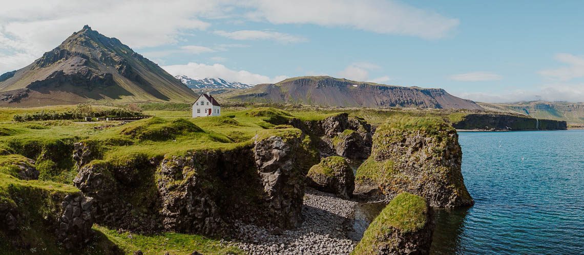 Die 3-stündige Fahrt vom Campingplatz aus brachten wir mit Podcasts schnell über die Bühne, dann winkte unser erstes Highlight: Der Wasserfall Kirkjufellsfoss, eines DER Postkartenmotive in Island. Weiter ging es nach Anarstapi, wo am Hafen ein weißes Haus über den Klippen und vor einem Vulkan thront. Ebenfalls in Anarstapi befindet sich der steinerne Troll und ein wunderschöner Klippenwanderweg, dem wir gerne weiter gefolgt wären.