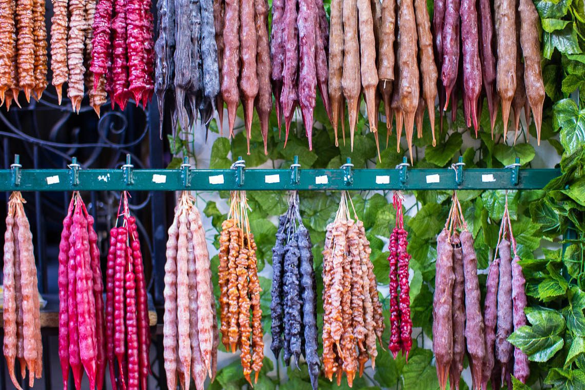 • ESSEN & TRINKEN | “Kein Gericht ohne Koriander” scheint die unausgesprochene Devise in Georgien zu sein. Für Menschen wie mich, die Koriander überhaupt nicht mögen, eine Herausforderung. Generell ist das georgische Essen sehr deftig und reichlich. Mein Tipp: Mindestens einmal in einem Homestay übernachten, bei dem die Gastgeberin bekocht. Ein echtes Erlebnis! Landestypische Speisen, die ohne Koriander auskommen sind Khinkali, mit Käse, Pilzen, Kartoffeln oder Fleisch gefüllte Teigtaschen, die am Strunk haltend erst leer geschlürft werden und dann verspeist werden. Der Strunk selbst wird nicht mitgegessen. Der georgische Käse hat einen gewöhnungsbedürftigen Geschmack und wird in vielerlei Gerichten verarbeitet. So auch in Kachapuri, eine Mischung eine Mischung aus Käsebrot und Käsepizza, teilweise auch mit Ei und Butter. Etwas weniger deftig und vegan ist das Lobiani, das mit Bohnenmus gefüllte Teigschiffchen. Etwas gewöhnungsbedürftig aber definitiv probiert werden sollten Tschurtschchela, mit Traubensaft-Kuvertüre überzogene Walnüsse, die wie farbige Perlenketten anmuten und an Straßenständen gekauft werden können. Wer Mzcheta, der alten Hauptstadt, einen Besuch abstattet sollte dort unbedingt die Bohnensuppe Lobi probieren. Getrunken wird wahlweise Wein – ich liebe den süßen Rotwein Kindzmarauli – oder “Tschatscha” oder auch „Chacha“(Weinbrand). Beides gerne in rauheren Mengen. Ein typisches, unalkoholisches Getränk ist „Kompot„, der Saft von eingemachten Früchten.