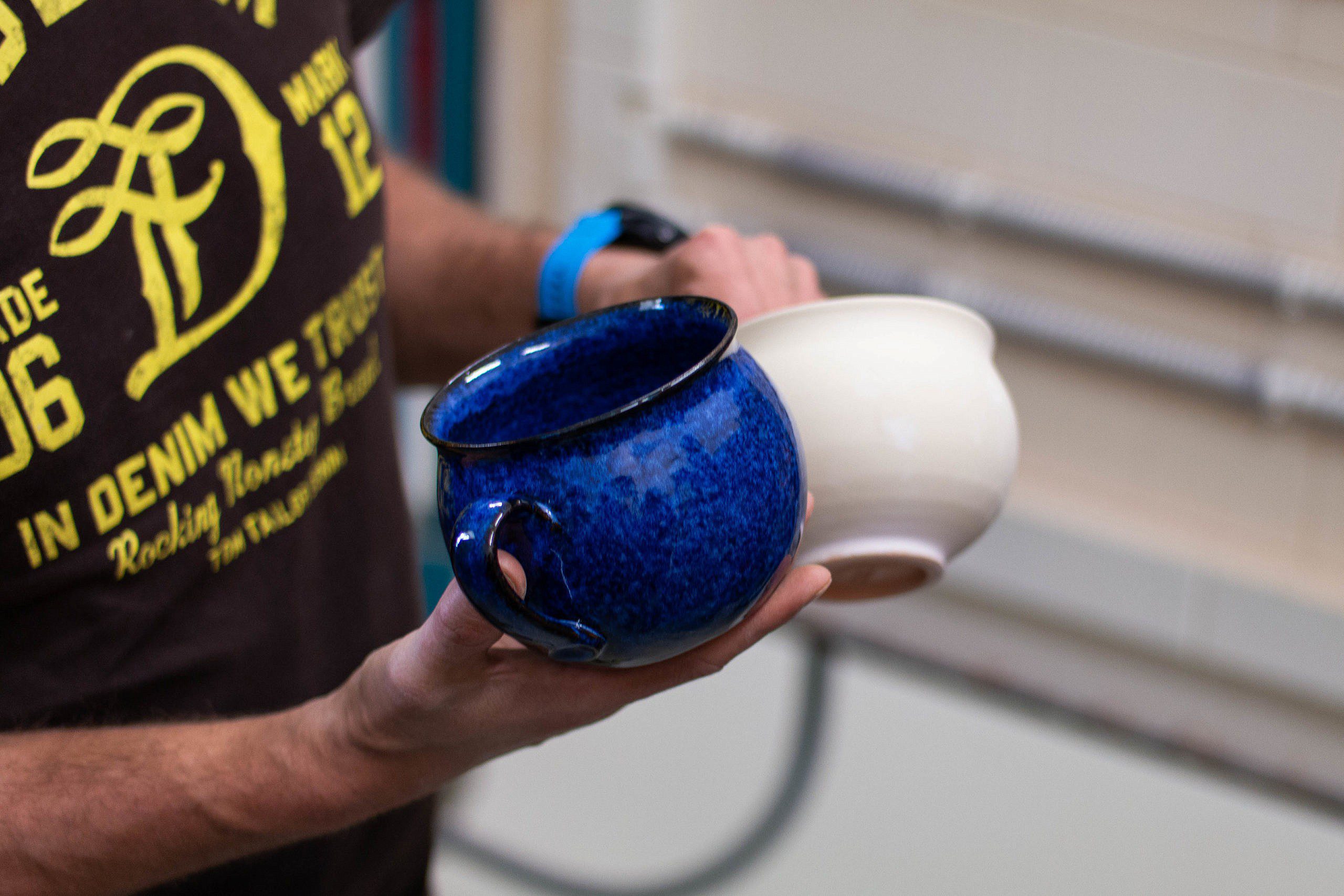 Mein dritter Held ist Marcel Konitzki aus der Töpferei Königsblau. Auch er hat die Sucht erfolgreich hinter sich gelassen und Gebrauch gemacht vom Angebot von Scarabäus, eine Ausbildung im eigenen Betrieb zu machen. Heute ist er Geselle und erklärt uns fachkundig den aufwendigen Prozess vom Tonklumpen über die Töpferscheibe, der Bemalung und Glasur zur handgefertigten Teekanne, Schale oder Tasse. Bis zu 100 Tassen oder Schalen und bis zu 16 Teekannen pro Tag schafft ein ausgelernter Töpfer pro Tag. Der Brennofen läuft beinahe täglich, schließlich muss jedes Stück zweimal gebrannt werden und der Verkauf der Königsblau Keramik findet bundesweit großen Anklang.