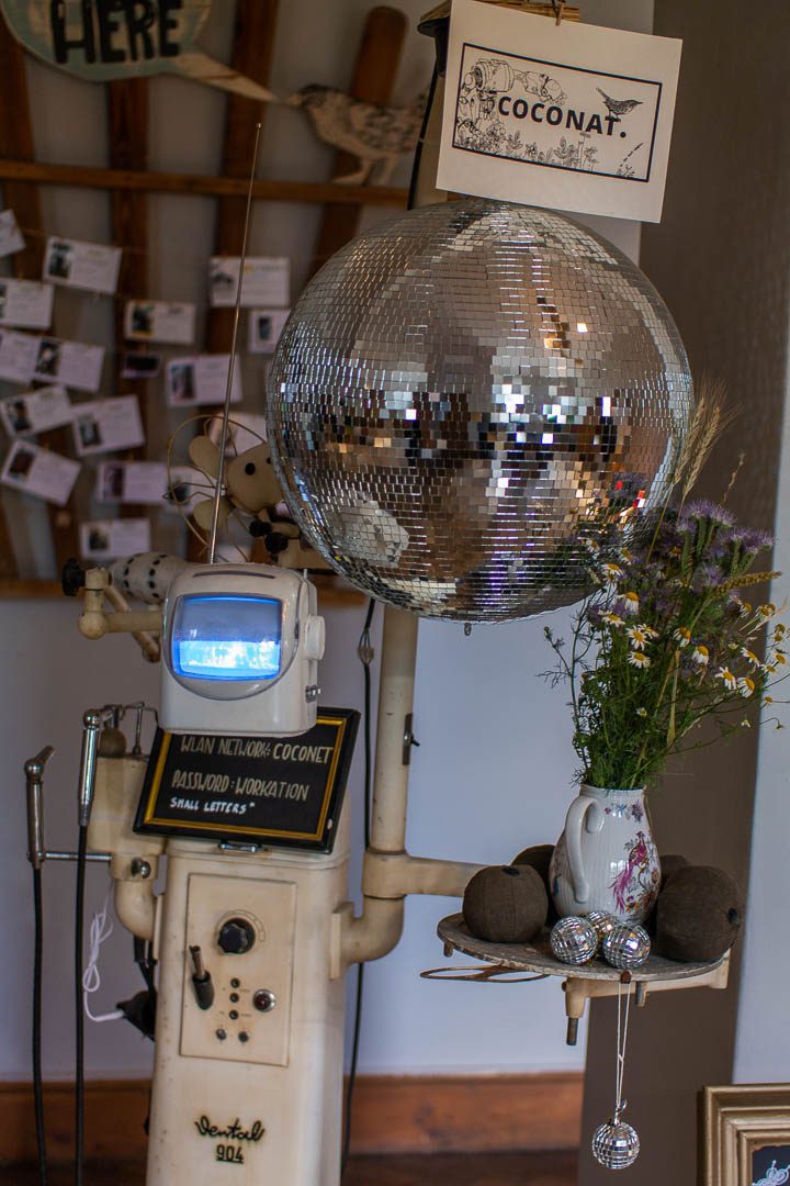 Was sie sich von ihren Reisen bewahrt haben ist der Wunsch nach kreativem Austausch, Gemeinschaft und einer gesunden Work-Life Balance. Und genau das bildet die Pfeiler von Coconat (Abkürzung für “community and concentrated work in nature”). In den Räumlichkeiten, in denen einst die Arbeiterwohnungen von Gut Schmerwitz und danach ein Hochzeitshotel untergebracht waren, befinden sich heute eine gemütliche Bar, ein Wohnzimmer, verschiedene Arbeitsräume, Esszimmer und Gästezimmer. Darüber hinaus locken auf dem weitläufigen Gelände ein Bildungsgarten mit Permakultur, ein Yogaraum, eine Sauna und verschiedene Rückzugsorte zum Entspannen. Dass der Austausch neben dem konzentrierten Arbeiten zentral steht, merkt man schon beim Betreten des Hauptgebäudes: Dort wird auf einer Pinnwand festgehalten, wer gerade vor Ort ist und über was er/ sie sich gerne austauschen möchte. Das Mittag- und Abendessen ist im Übernachtungspreis inbegriffen und wird gemeinsam eingenommen. Dabei wird ausgegangen von vegetarischer Kost. Wer Fleisch will, zahlt etwas mehr. Auch die Bar funktioniert anders, als man es gewöhnt ist. Snacks für den kleinen Hunger zwischendurch stehen bereit. Und wer etwas trinken will, bedient sich und setzt es auf die Strichliste. Erfrischend anders! Und ein Ort, an dem man sich sofort heimisch und willkommen fühlt.