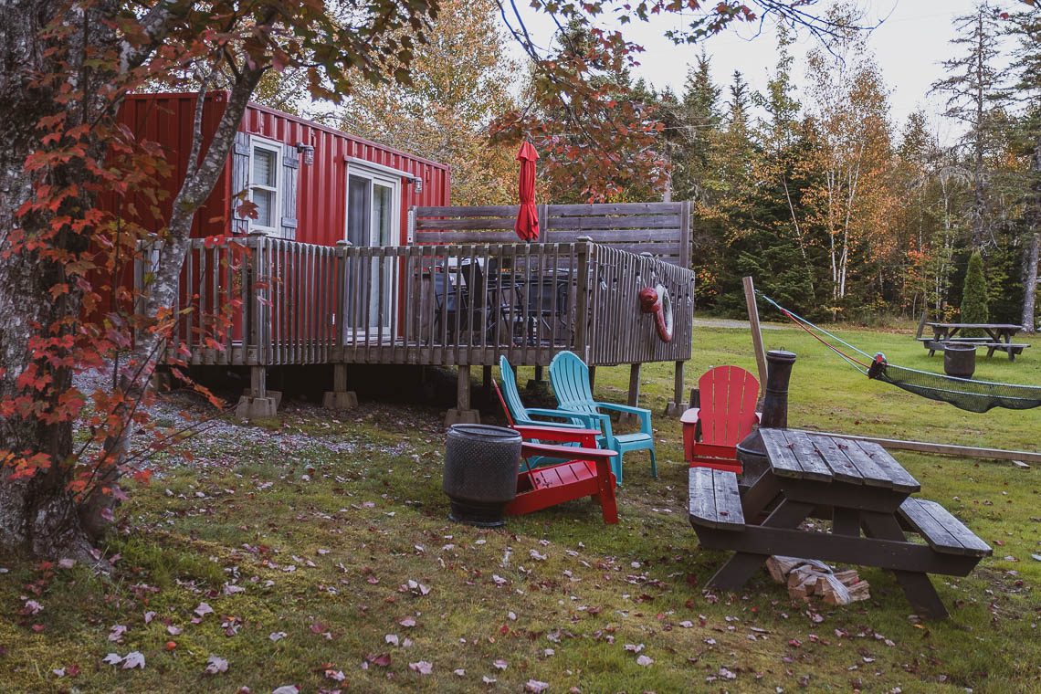 Unsere erste besondere Unterkunft in Nova Scotia war genau so, wie man sich eine Cabin in Kanada vorstellt: Eine urgemütliche Blockhütte mit zwei Doppelbetten, Toilette, Mikrowelle und Kühlschrank. Auf der überdachten Terrasse stehen zwei Adirondack Stühle, von mir nur Kanada-Stühle genannt, in denen man die Morgensonne genießen oder abends rund um die Feuerschale – gebaut aus einer alten Waschmaschinentrommel – sitzen kann. Auch eine Picknickbank ist vorhanden. Was mir besonders gut gefallen hat, ist, wie sauber und gut ausgestattet sowohl die Cabin als auch der Campingplatz, auf dem sie stand, war.