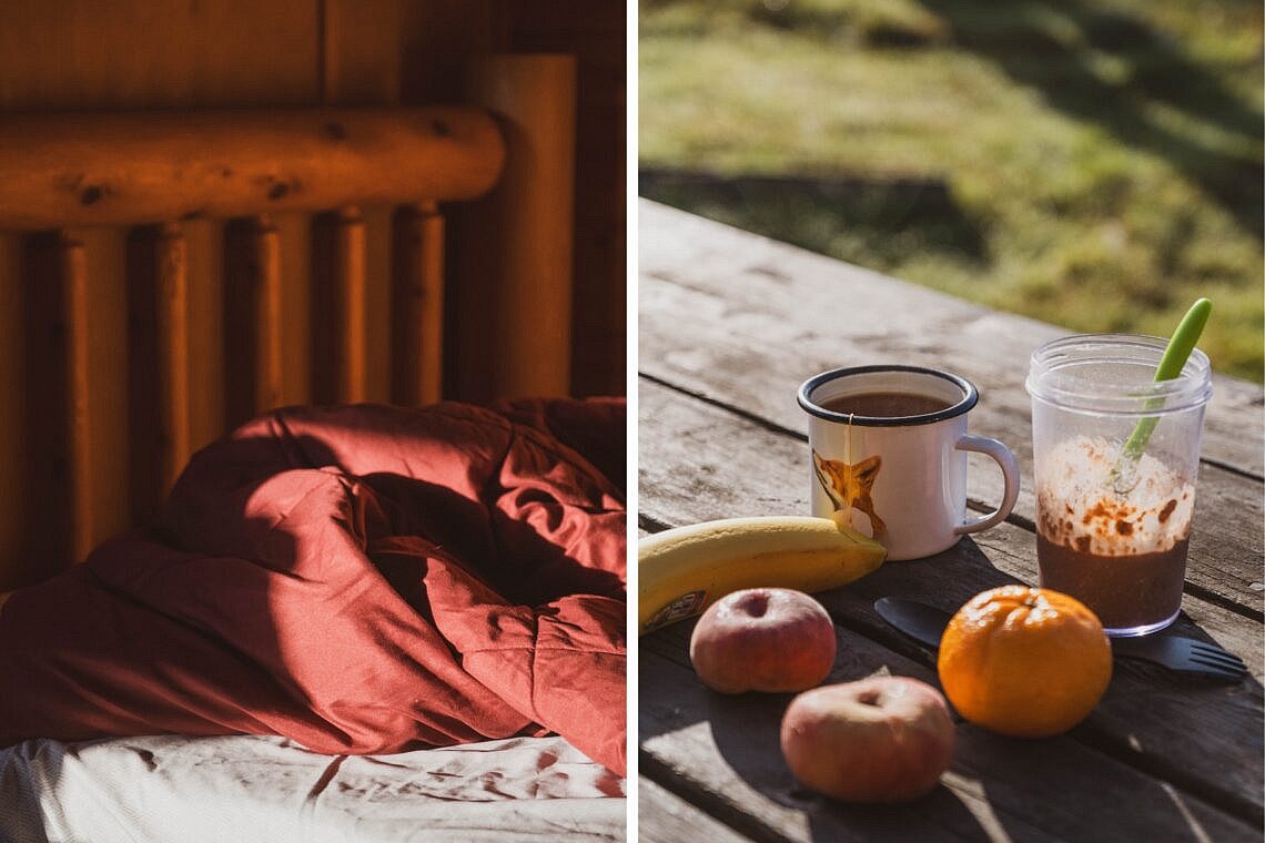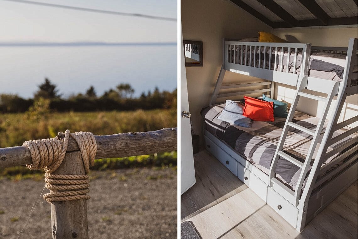 Sooo gemütlich! Ist der erste Gedanke, der mir beim Betreten unseres Bunkies, wie die kleine weiße Hütte genannt wird, durch den Kopf geht. Auf kleinster Fläche finden im Inneren ein Hochbett für 3 Personen (unten Doppel- und oben Einzelbett), ein Schaukelstuhl und ein Tisch mit Stühlen Platz. Vor der Hütte stehen bunte Stühle bereit, um den Blick aufs Meer zu genießen, in dem Abends die Sonne versinkt. Ebenfalls mit Blick aufs Meer ist die Feuerstelle, die sich unterhalb der beiden Bunkies befindet, sowie die Terrasse vor dem Gemeinschaftsraum, welcher zum Verweilen und Kleinigkeiten zubereiten einlädt. Die Gastgeber waren unglaublich herzlich und hielten jede Menge Tipps für die Umgebung bereit, was uns bedauern ließ, dass wir nur eine Nacht blieben.