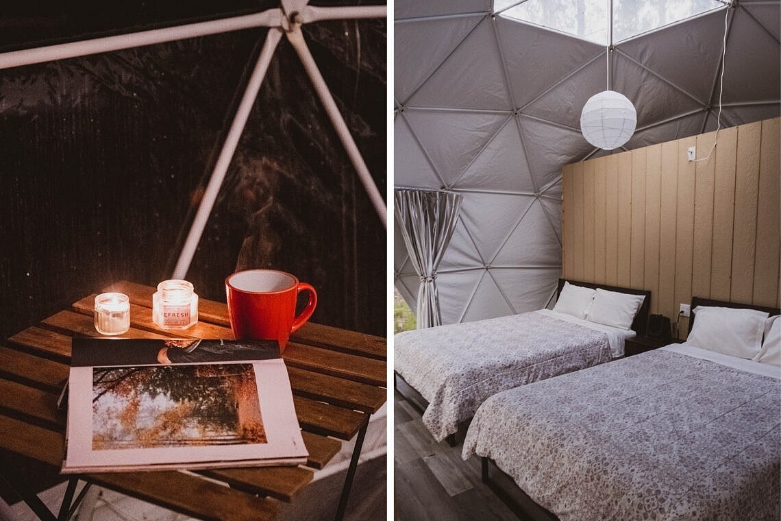 - Unterkünfte: Domes mit eigener Kitchenette mit Wasserkocher und visuell abgetrennter Toilette, Dusche und Waschbecken.