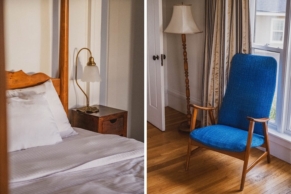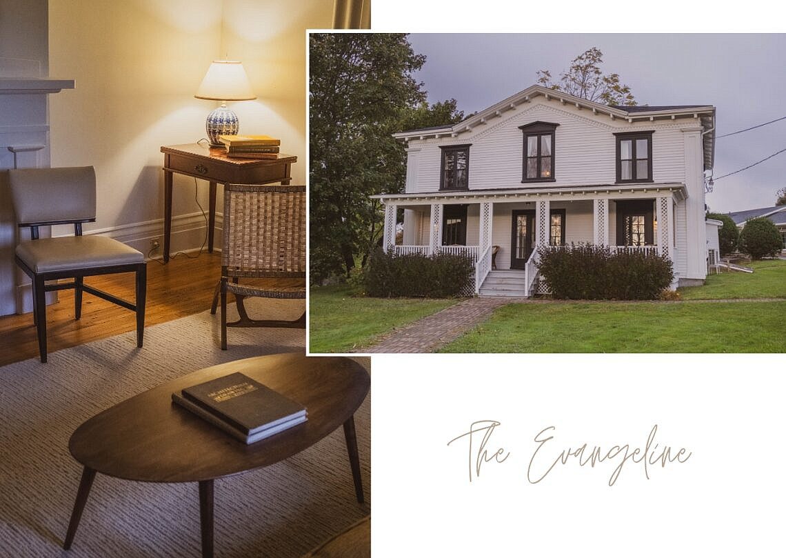 Mitten in Nova Scotia’s Wine Country befindet sich The Evangeline, ein Motel mit verschiedenen Unterkünften. Diese sind alle sehr unterschiedlich eingerichtet und variieren von modern bis antik. Ich hatte das große Glück, eines der fünf Gästezimmer im Borden House zu erwischen. Dieses ist das 1858 erbaute Elternhaus von Sir Robert Borden, dem ehemaligen Prime Minister von Kanada. Neben einer überdachten Veranda bietet das Haus auch eine stilvolle Library mit Sitzmöbeln und ein Tea Room, in dem eine Nespresso Maschine und ein Weinkühler bereitstehen. Überall im Haus sind Erinnerungsstücke der Borden-Familie wiederzufinden, so auch in meinem “Borden King”-Zimmer, welches sehr geschmackvoll mit antiken Möbel aus der Borden-Ära eingerichtet war.