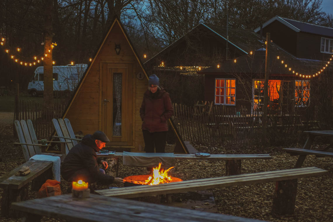 Es besteht aus mehreren Sami-Feldern, auf dem Gäste mit eigener Ausrüstung ihr Zelt aufschlagen oder ihren Camper parken können, einem Event-Bereich mit einer großen skandinavischen Grillhütte, und dem Glampingbereich, in welchem sich neben schwedenroten Holzhäusern auch Glockenzelte und Tiny Houses befinden. Alle Glampingunterkünfte bestechen durch ihre urgemütliche, skandinavische Einrichtung und die Feuerstellen, die sich jeweils mehrere Unterkünfte miteinander teilen und auf denen gekocht werden kann. Das Kochen über dem Feuer und lange Abende am Lagerfeuer gehört für Manon nämlich zum Skandinavien-Feeling unbedingt dazu! Recht hat sie!