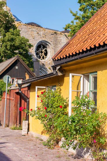 Die wohl am meisten fotografierteste Straße von Visby ist das schmale, von niedrigen, mit Rosen überrankten Häusern Gasse Fiskargränd, durch die bereits Pippi Langstrumpf mit ihren Freunden Tommy und Annika streifte und einen Süßigkeitenladen plünderte.