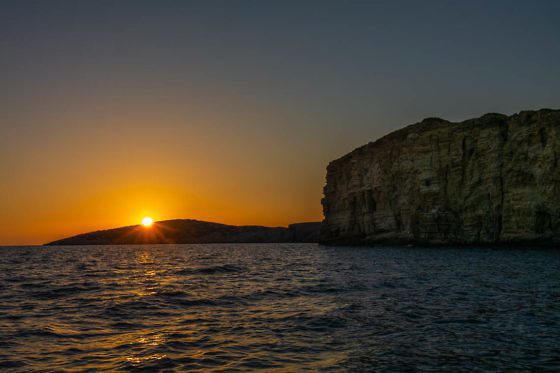 Wir werden von Michalis, dem Besitzer unserer Unterkunft, eingeladen, zusammen mit ihm Fischen zu gehen. Ein erstes Mal. Langsam lassen wir das in warmes Abendlicht getauchte Lipsi hinter uns und halten uns in Richtung der unbewohnten, umliegenden Inseln. Dass der Fischfang heutzutage etwas moderner zugeht, zeigt uns Michalis wenig später. Auf einem kleinen Monitor kann er nicht nur die Tiefe des Wassers ablesen sondern sieht auch, wo Fische sind und in welcher Tiefe sie sich aufhalten. Eine gehörige Portion Glück gehört trotzdem dazu, dass sie anbeißen. Nachdem er beim Auslaufen bereits erfolglos versucht hat, Fische zu angeln, widmet er sich jetzt den Tintenfischen. Während die Sonne hinter der nächsten Insel versinkt und der Mond aufgeht, wirft Michalis seine Leine aus. Diesmal hat er Glück: Nach kurzer Zeit beißt tatsächlich ein Tintenfisch an. Der Anblick seiner riesigen Augen und der verzweifelte Versuch wegzukommen durch das Spritzen von Tinte stimmt mich traurig. So sieht also ein Tintenfisch aus, bevor er auf dem Teller landet. Nachdenklich beobachte ich, wie Michalis noch eine Handvoll Tintenfische fängt. Immer wieder fährt er dabei an eine andere Stelle. Mit Romantik hat die Fischerei gar nix zu tun, schlußfolgere ich schließlich. Lediglich mit harter Arbeit, jede Menge Geduld und einer großen Portion Glück. Ein prägendes Erlebnis!