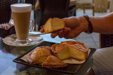 Die Bäckerei Kairis ist eindeutig der Dreh- und Angelpunkt der Insel. In den Sommermonaten ist sie 24 Stunden geöffnet und dient als Frühstücksadresse, Tante Emma-Laden, Bar, Café, Eisdiele und kulinarischer Souvenirladen gleichzeitig. Gefühlt kommt jeder Einwohner und Tourist mindestens einmal am Tag hier vorbei, sei es für einen Laib Brot (es gibt 14 verschiedene Sorten), einen Cappuccino oder einen Kaffeeklatsch. Takis Kairis, der Besitzer, hält die Bäckerei mit 17 Mitarbeitern Tag und Nacht am Laufen. Keine einfache Aufgabe bei dem unglaublichen Ausmaß des Angebots, welches zum Großteil selbst produziert wird. Besonders stolz ist die Bäckerei auf ihre traditionellen Spezialitäten mit lokalen Produkten. Vom selbstgemachten Eis mit Milch von der Insel, herzhaften Käsekuchen mit einem Eier-Käsegemisch bis hin zu traditionellen Nachspeisen und Kuchen gibt es hier alles. Meine absolute Empfehlung gilt auch dem göttlichen warmen Schokokuchen mit flüssiger Schokoladensoße. Mmmmh!