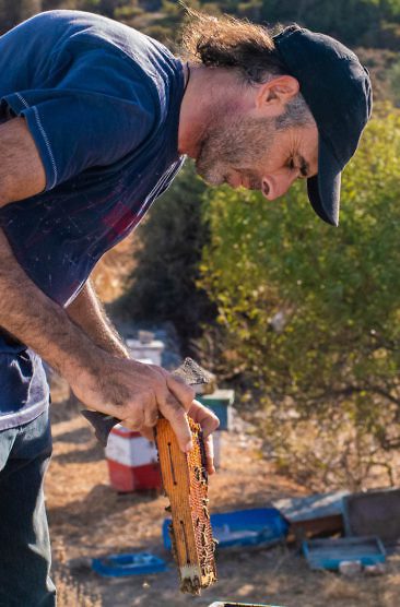 Aufgrund des Verzichts von Pestiziden ist Lipsi ein echtes Paradies für Bienen. In den Mai bis Juli schwärmen die Bienenscharen der 130 farbenfrohen Kästen von Pantelis Klapsis aus und bilden die Grundlage zur Herstellung von Thymianhonig, Kerzen, Anti-Aging Creme und leckerer Sesam-Honig-Zimt-Riegel. Als uns Pantelis erzählt, dass bis zu 210.000 Bienen in einem Bienenkasten wohnen, fällt mir die Kinnlade herunter. Seit dem Jahr 2000 hält er hier auf Lipsi seine Bienen. Bereits sein Vater besaß Bienen, Pandelis folgte der Familientradition. Seine zweite Leidenschaft gilt der Kunst – ob aus Kerzenwachs, Treibholz oder Bienenrahmen. Pantelis kann jederzeit besucht werden, wenn das Gatter zu seinem Grundstück geöffnet ist. Andernfalls kann man seinen Honig auch bei der Bäckerei erwerben.