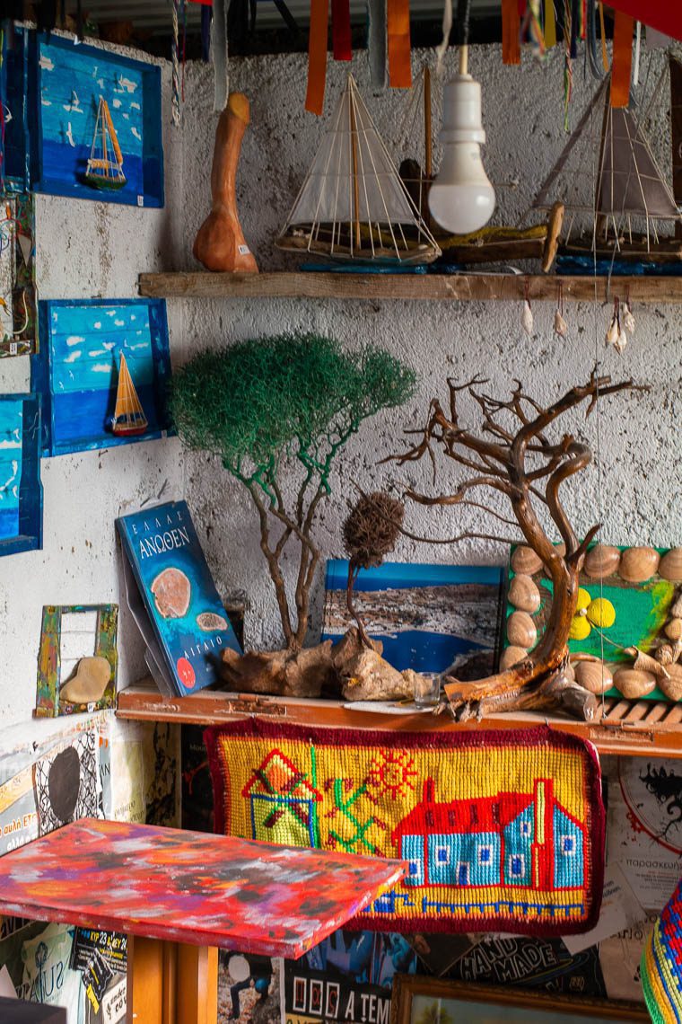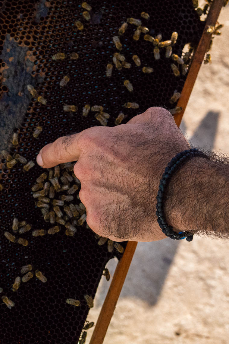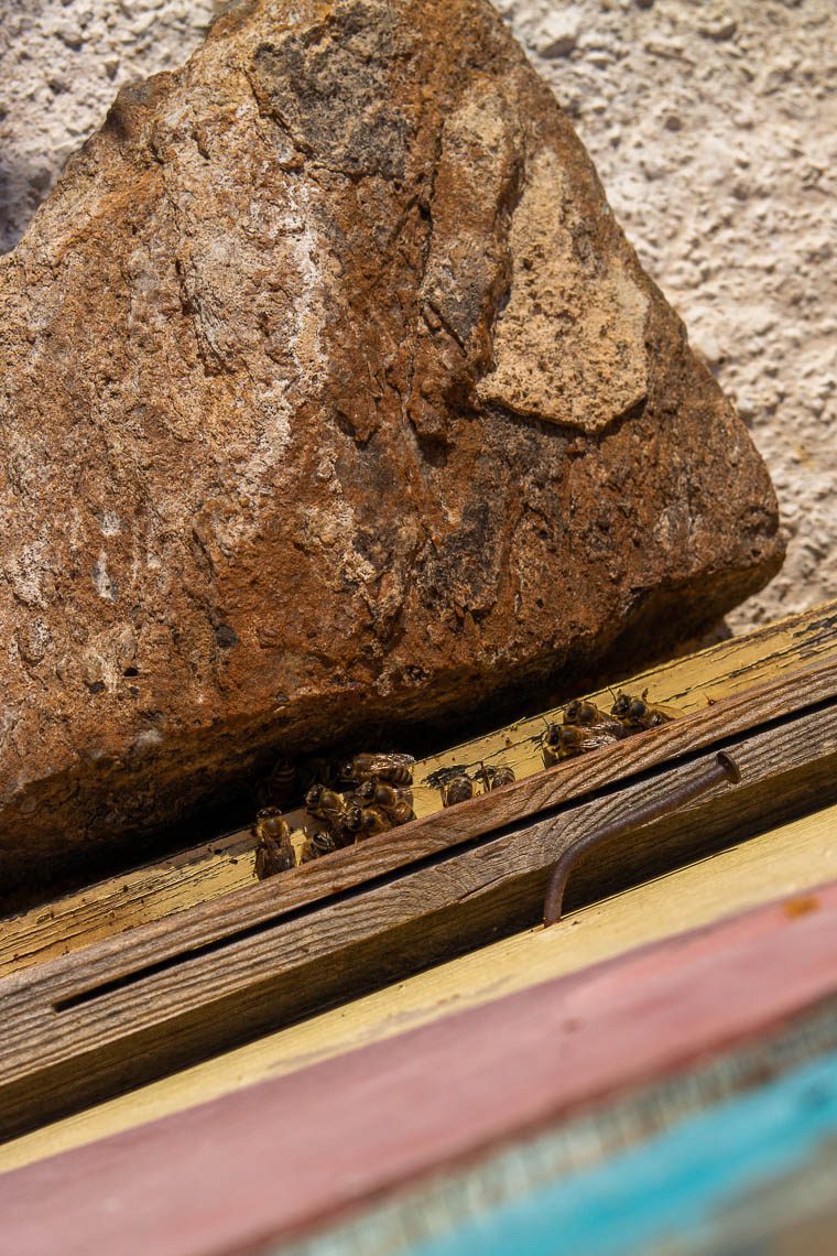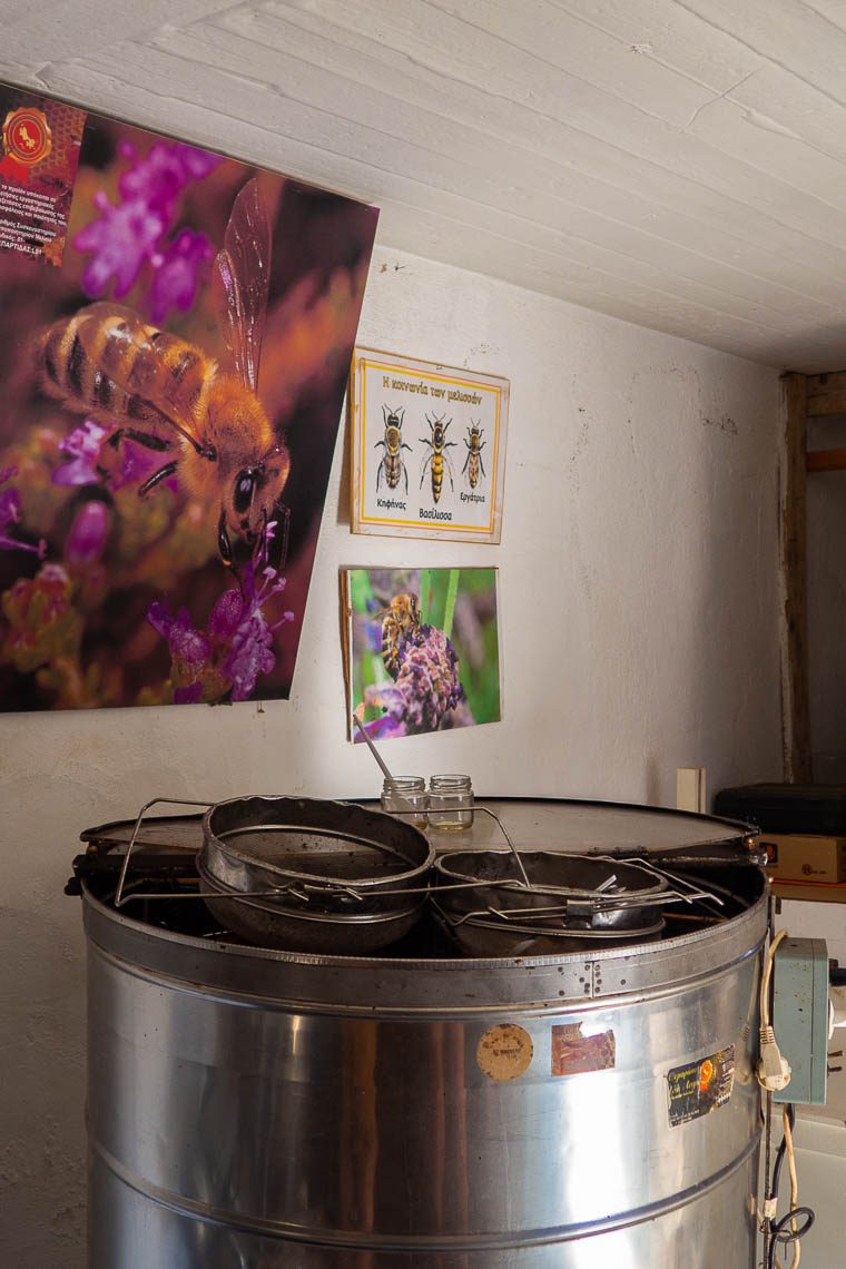 Aufgrund des Verzichts von Pestiziden ist Lipsi ein echtes Paradies für Bienen. In den Mai bis Juli schwärmen die Bienenscharen der 130 farbenfrohen Kästen von Pantelis Klapsis aus und bilden die Grundlage zur Herstellung von Thymianhonig, Kerzen, Anti-Aging Creme und leckerer Sesam-Honig-Zimt-Riegel. Als uns Pantelis erzählt, dass bis zu 210.000 Bienen in einem Bienenkasten wohnen, fällt mir die Kinnlade herunter. Seit dem Jahr 2000 hält er hier auf Lipsi seine Bienen. Bereits sein Vater besaß Bienen, Pandelis folgte der Familientradition. Seine zweite Leidenschaft gilt der Kunst – ob aus Kerzenwachs, Treibholz oder Bienenrahmen. Pantelis kann jederzeit besucht werden, wenn das Gatter zu seinem Grundstück geöffnet ist. Andernfalls kann man seinen Honig auch bei der Bäckerei erwerben.