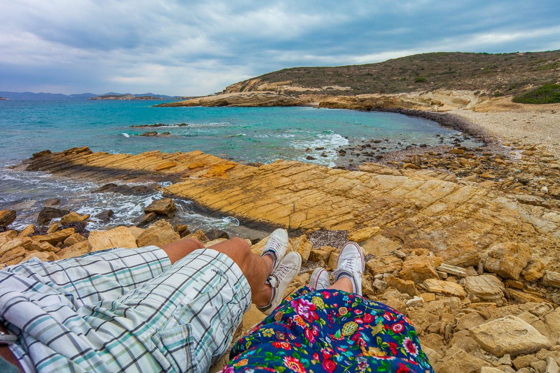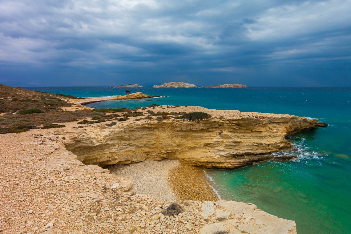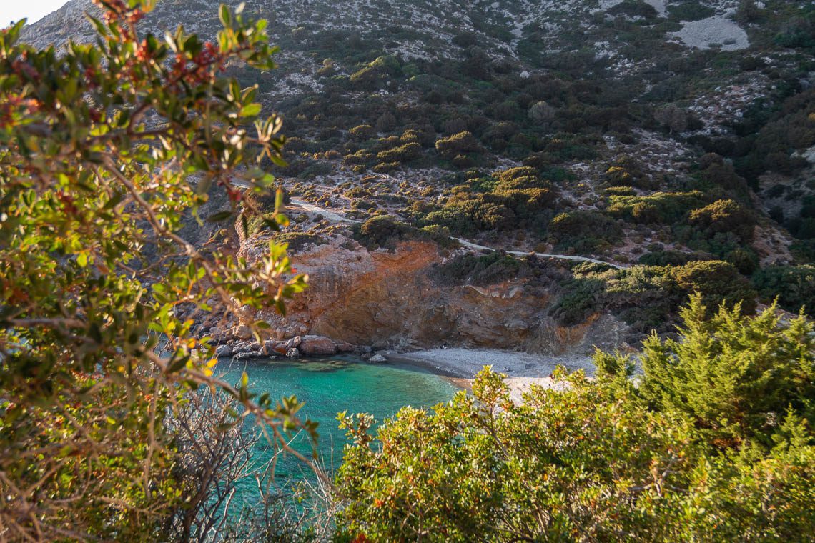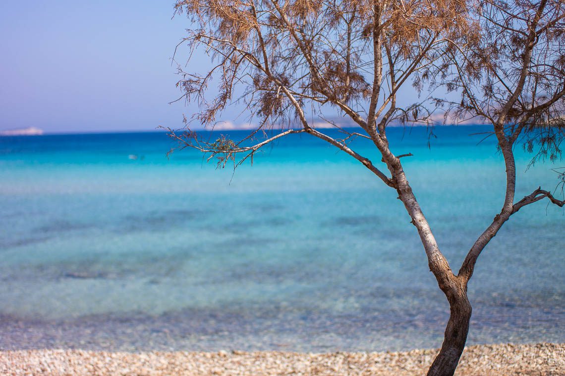 Ein einsames Wacholderbäumchen ist der Namensgeber des Monodendri Strandes. Dieser liegt an der Ostküste von Lipsi, ist (zumindest das letzte Stück) nur fußläufig erreichbar und bietet eindeutig die schönste Panoramaaussicht. Geschichtete goldene Felsen bilden eine Halbinsel, die durch zwei steinige Strände mit dem Festland verbunden ist. Mitten auf der Insel thront das Bäumchen und drei unbewohnte Inseln bilden die Kulisse. Ein echter Postkartenblick! Aufgrund der abgelegenen Lage hatten wir den Strand für uns alleine. Für ein Bad im Meer empfehle ich hier Badeschuhe, der Untergrund ist steinig.