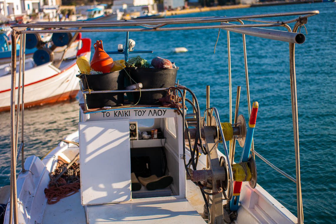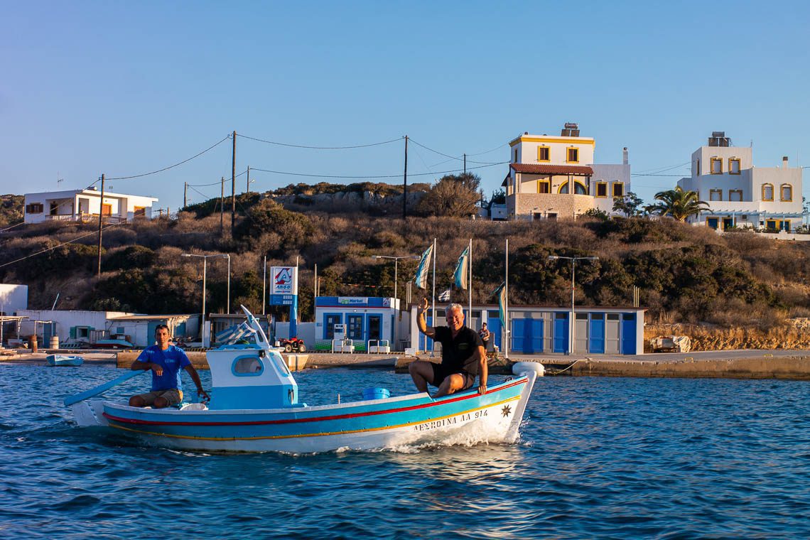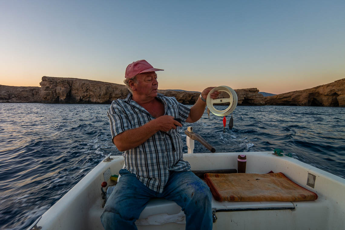Rosa, pink und gelb schaukelt das Boot von Pantelis Gryllis vorm familieneigenen Restaurant Yiannis. Dieses ist benannt nach seinem Vater, der das Restaurant zusammen mit ihm führt. Die Familie hat einen eigenen Bauernhof, auf dem sie den Käse für das Restaurant herstellen. In Nullkommanichts füllt sich unser Tisch mit Spezialität wie Fischkroketten, Dako Ellinikos, Saranaki, Symiako, fruchtig eingelegtes Carpaccio vom Schwertfisch, Tintenfischbällchen, Kalamari und Salat mit Manouli Käse. Wir kommen aus dem Staunen und Essen gar nicht mehr heraus. Etwas später gesellt sich Pantelis zu uns und erzählt über sein Leben auf der Insel. In den Wintermonaten, wenn das Restaurant geschlossen ist, geht er mit Vorliebe seiner zweiten Leidenschaft – neben dem Restaurant – nach: Dem Fischen.