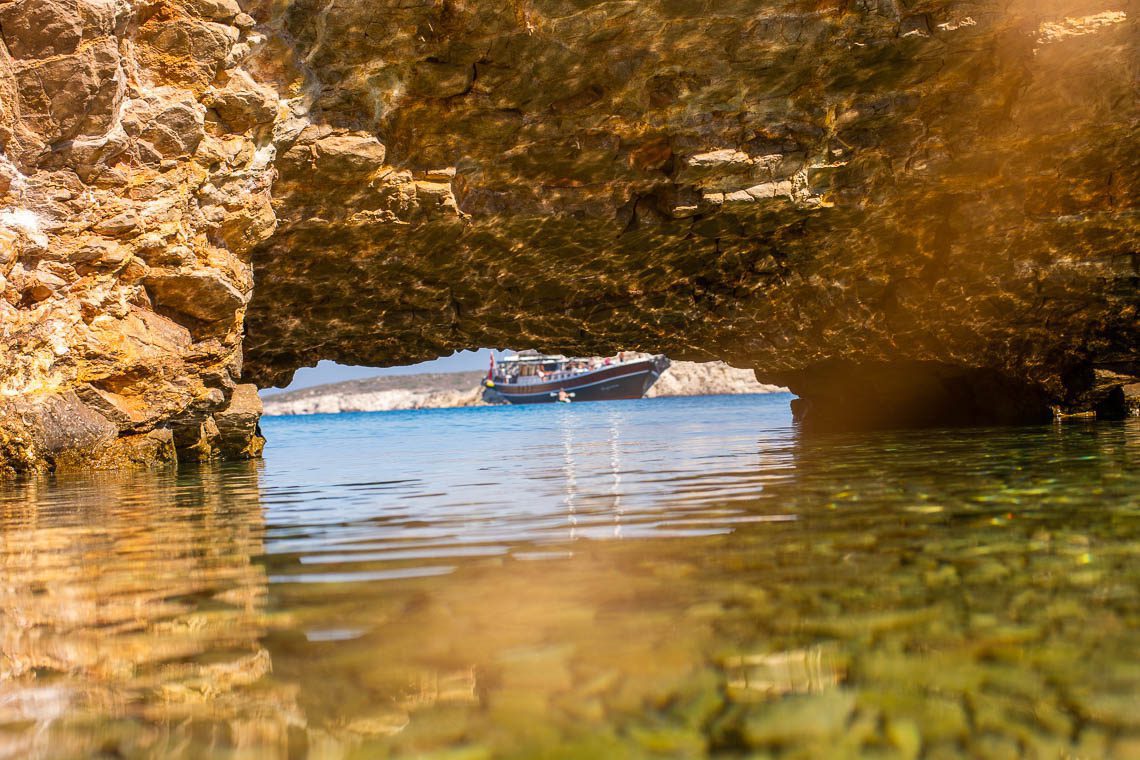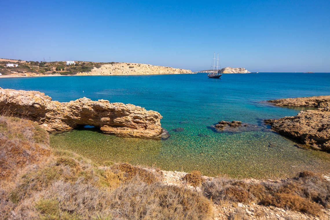 Nicht groß aber besonders ist die kleine Bucht, welche sich etwas südlich vom Chochlacura Strand befindet. Wie ein Halbmond ist die Bucht geformt, mit einem Felsvorsprung an der einen Seite, der eine natürliche Höhle und gleichzeitig natürlichen Sonnenschutz formt. Was sie so besonders macht: mitten im Fels ist ein Loch, durch das man schwimmend auf die andere Seite gelangen kann. Der Untergrund ist steinig, allerdings sind die Steine schön abgerundet und das Wasser so klar, dass man bereits vom Strand aus kleine Fische beobachten kann.