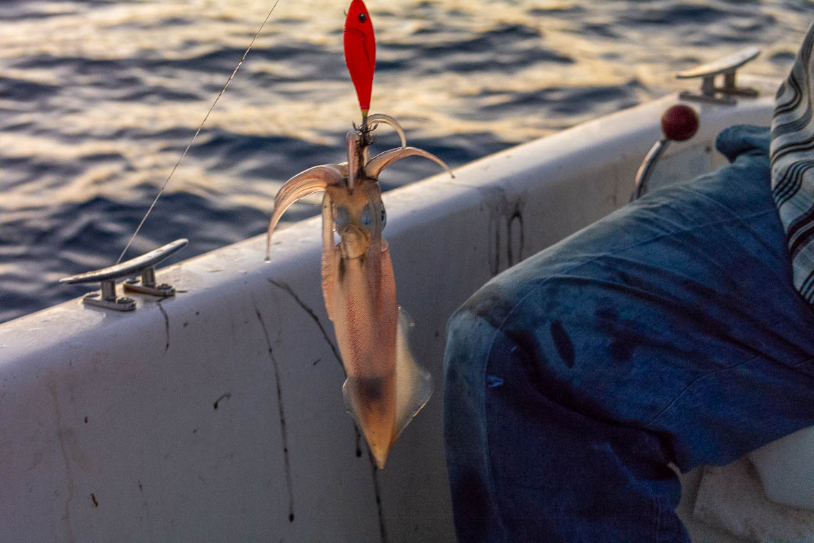 Wir werden von Michalis, dem Besitzer unserer Unterkunft, eingeladen, zusammen mit ihm Fischen zu gehen. Ein erstes Mal. Langsam lassen wir das in warmes Abendlicht getauchte Lipsi hinter uns und halten uns in Richtung der unbewohnten, umliegenden Inseln. Dass der Fischfang heutzutage etwas moderner zugeht, zeigt uns Michalis wenig später. Auf einem kleinen Monitor kann er nicht nur die Tiefe des Wassers ablesen sondern sieht auch, wo Fische sind und in welcher Tiefe sie sich aufhalten. Eine gehörige Portion Glück gehört trotzdem dazu, dass sie anbeißen. Nachdem er beim Auslaufen bereits erfolglos versucht hat, Fische zu angeln, widmet er sich jetzt den Tintenfischen. Während die Sonne hinter der nächsten Insel versinkt und der Mond aufgeht, wirft Michalis seine Leine aus. Diesmal hat er Glück: Nach kurzer Zeit beißt tatsächlich ein Tintenfisch an. Der Anblick seiner riesigen Augen und der verzweifelte Versuch wegzukommen durch das Spritzen von Tinte stimmt mich traurig. So sieht also ein Tintenfisch aus, bevor er auf dem Teller landet. Nachdenklich beobachte ich, wie Michalis noch eine Handvoll Tintenfische fängt. Immer wieder fährt er dabei an eine andere Stelle. Mit Romantik hat die Fischerei gar nix zu tun, schlußfolgere ich schließlich. Lediglich mit harter Arbeit, jede Menge Geduld und einer großen Portion Glück. Ein prägendes Erlebnis!