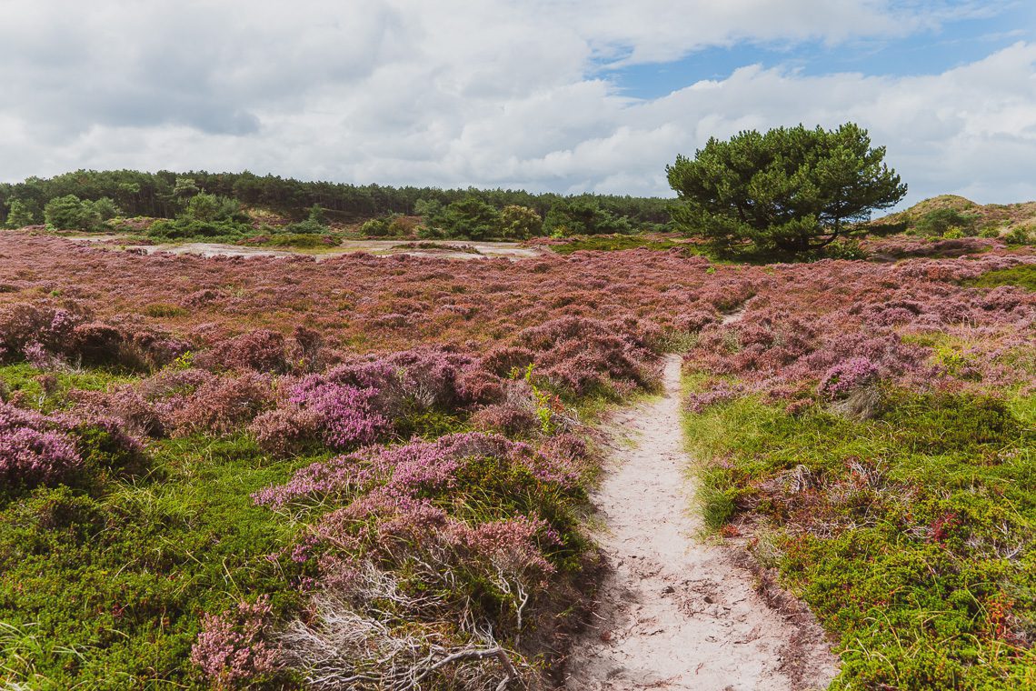 Weiter schlängelt sich die Wanderung auf natürlichen, sandigen Pfaden abwechselnd durch Heidefelder und über Dünen hinweg. Bis dann plötzlich das Kreischen der Möwen etwas lauter wird und das Meer über die Dünengipfel hinweg blitzt.