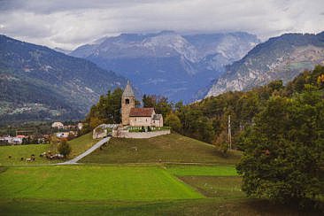 - Die Kapelle San Romerio mit ihrer majestätischen Lage am Abgrund über dem Lago di Poschiavo.