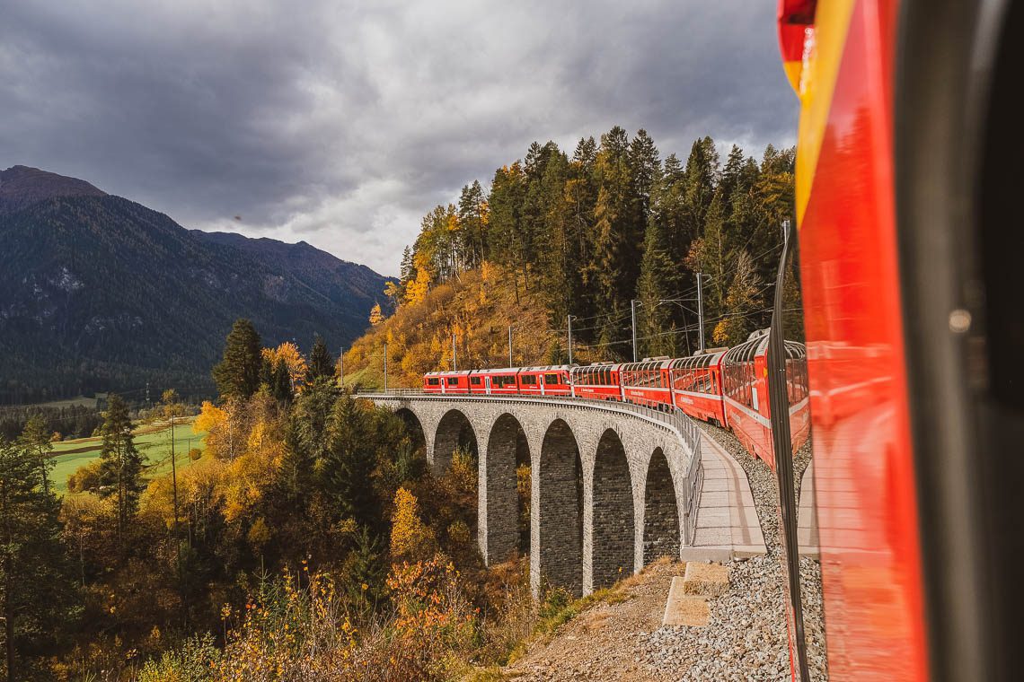 Den Bernina Express buchst Du auf dieser Webseite. Wenn finanziell möglich, gönne Dir eine Fahrt im Panorama-Wagen (vorzeitig zu reservieren). Du wirst es nicht bereuen! Auf dem Gang gibt es Fenster, die geöffnet werden können. Von dort aus kannst Du Fotos der spektakulären Viadukte ganz ohne Spiegelung machen. Unbedingt aus dem Fenster schauen solltest Du bei Filisur, dort befindet sich das imposante Landwasserviadukt und bei Brusio, dort ist das Kreisviadukt.