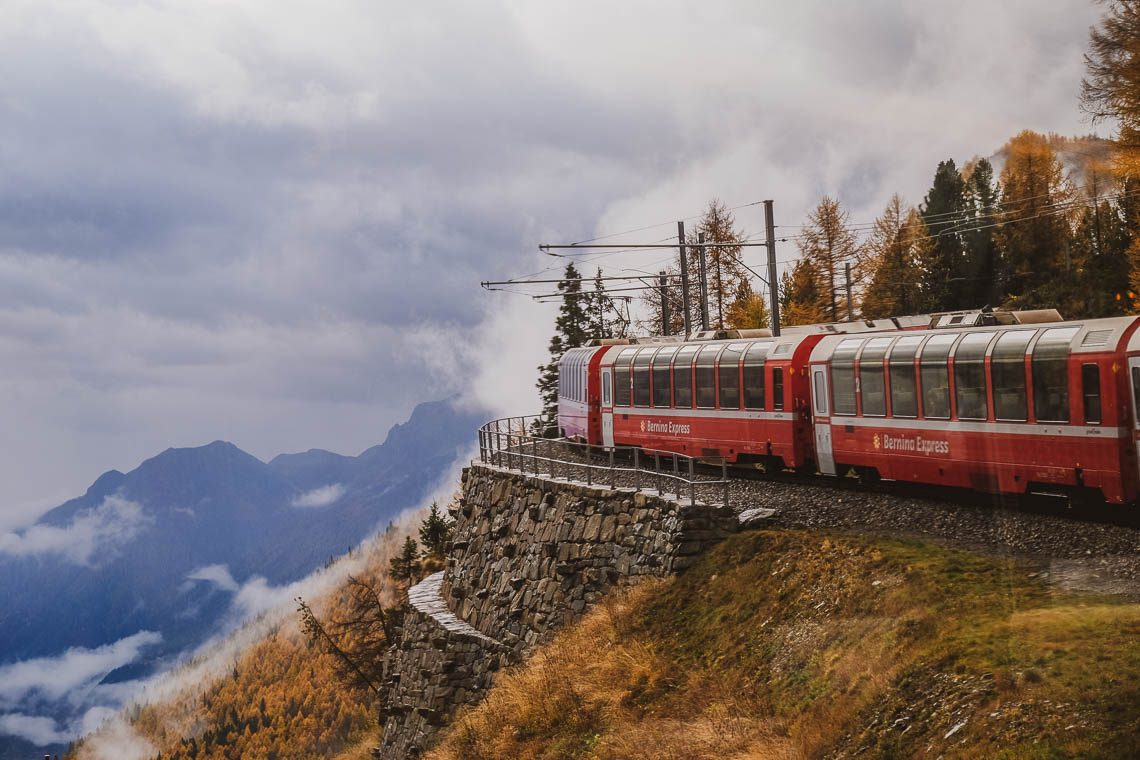 Die spektakulärste und nachhaltigste Anreise in die Valposchiavo erfolgt mit dem Zug. Mit dem Zug ab Zürich über Chur erreichst Du Poschiavo nach knapp fünf Stunden. Ab Chur fährt die Rhätische Bahn/ Bernina Express auf der grandiosen UNESCO Weltkulturerbe-Strecke über die Alpen – auf deiner der höchsten und steilsten Bahnstrecken der Welt. Im Herbst ist die Fahrt nochmal um einiges spektakulärer. Die Panorama-Wagen des Bernina Express sind reservierungspflichtig, die normalen Wagen nicht. Generell lohnt sich die Anschaffung eines Swiss Travel Passes, bei dem nicht nur Zugfahren, sondern auch Bus- und Bootsfahren inklusive sind.