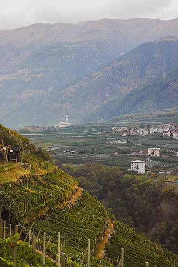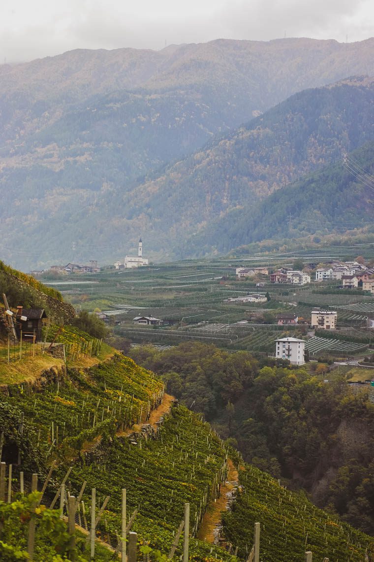 - Das von Weinbergen eingerahmte Tirano von oben, beispielsweise, wenn man sich ihm wandernd von San Romerio aus nähert.