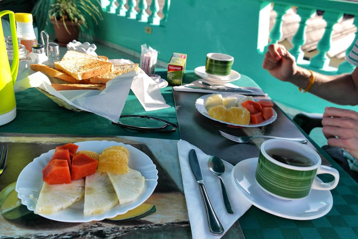 Das Essen in einem Casa Particular ist authentisch, reichlich und lecker. Zum Frühstück erhält man Rührei, Brot, verschiedene Aufstriche oder Wurst und Käse, einen Teller mit frischen, aufgeschnittenen Früchten, frischer Saft, Milch und Kaffee. Bei einer Casa gab es sogar kleine Pfannkuchen.