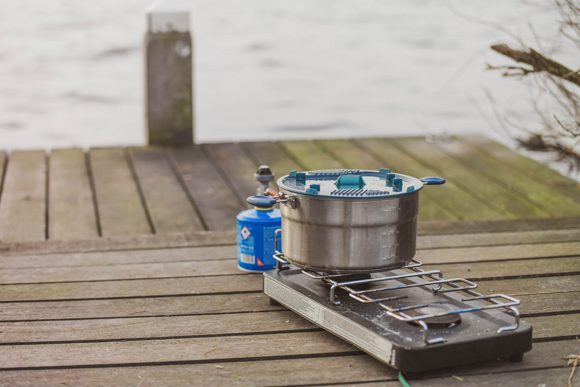 Nachdem wir die Isomatten in unser Zelt verfrachtet und die Schlafsäcke ausgerollt haben, machen wir uns daran, unseren Feuerkorb, die Stühle und den Campingkocher aufzustellen, denn die Sonne steht bereits tief – ein winziger Nachteil, wenn man so früh im Jahr campen geht. Während die Sonne langsam goldfarben am Horizont versinkt, entfachen wir ein gemütlich knisterndes Feuer und stellen das Nudelwasser auf den Campingkocher. Auf dem Menü steht ganz klassisch Spaghetti mit Tomatensoße, als Nachtisch gibt’s Mango. Bis wir unser Mahl schließlich zu uns nehmen, ist es schon lange dunkel geworden. Durch die behagliche Wärme des Feuers, die nächtliche Geräuschkulisse der Natur und den – heute besonders hell leuchtenden – Mond, herrscht eine beinahe magische Atmosphäre. Wäre das Feuer nicht irgendwann heruntergebrannt, wären wir wohl noch ewig sitzen geblieben.