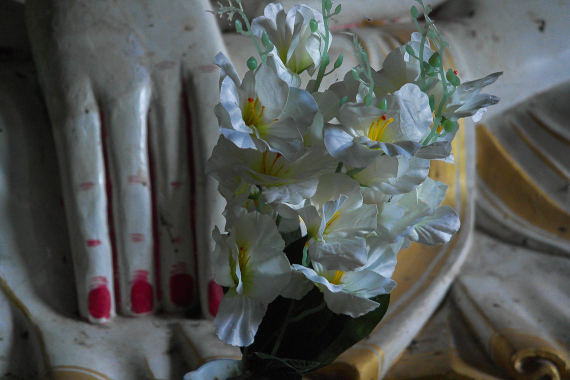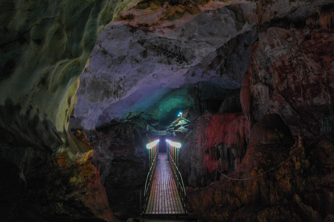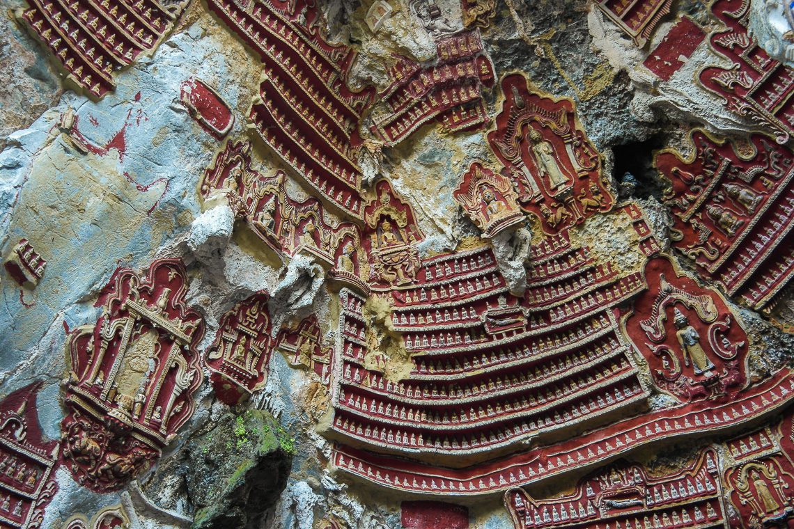 Die Saddan Cave fasziniert durch ihre unglaubliche Größe (800 m von einer Seite der Höhle zur anderen!), die gut erhaltenen Tropfsteine und dem Erlebnisfaktor, barfuss durch eine schummerige Höhle zu irren. Benannt ist sie nach einer Inkarnation Buddhas als Elefantenkönig Saddan – darum auch die Elefantenstatuen am Eingang. Der Anfangsbereich der Höhle ist mit einem großen, liegenden Buddha und einer Ansammlung an weiteren Statuen und Heiligtümern versehen. Diese weichen jedoch alsbald natürlichen Felsformationen und wir dringen tiefer ins Innere der Höhle vor. Beeindruckende, über jahrtausende entstandene Stalagmiten und Stalaktiten säumen unseren teilweise kaum, teilweise kitschig bunt beleuchteten Weg. Der Boden unter unseren nackten Fußsohlen (Pflicht im Tempel!) ist kühl und teilweise feucht. Langsam schwillt ein ungewohntes Kreischgeräusch über uns an: Fledermäuse. Hunderte davon. Aber das ist noch nicht alles: Der durch eine natürliche Höhlenöffnung erleuchtete kegelförmige Stalagmit mit goldenem Schirm und der Blick vom Ende der Höhle hinunter auf einen See mit farbenfrohen Booten gehört zu unseren Highlights. Tipp: Lass Dich von dort mit dem Boot zurück zum Eingang bringen. Die kurzweilige Fahrt führt durch eine niedrige Höhle und Reisfelder, auf denen (wenn Du wie wir Glück hast) die Seerosen blühen.