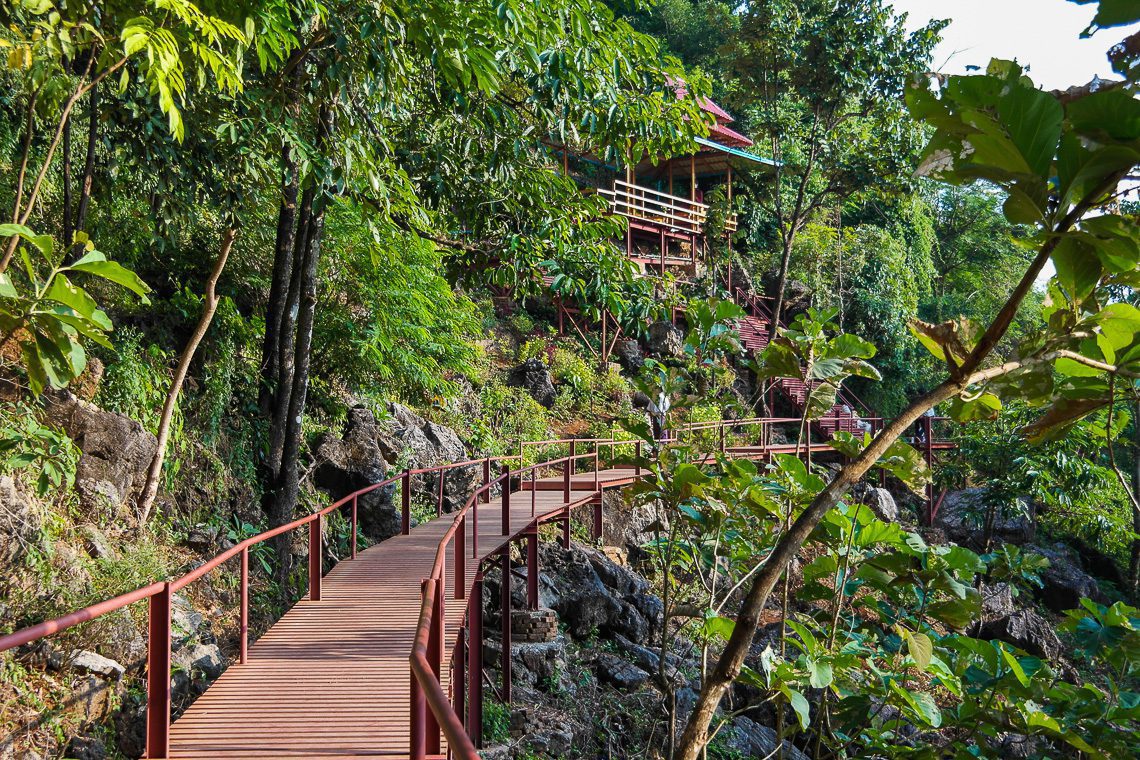 Wunderschön gestaltet, stufenweise von zwei Wasserbecken zur Felswand hinaufführend, liegt der reich verzierte Eingang der Ya Thay Pyan Cave. “Ya Thay” heißt übrigens Eremit, was die Höhle zur Eremitenhöhle macht. Diese hat uns nicht nur durch Ihre Diversität an von Moos überzogenen Statuen und Standbildern, sondern auch durch den Panoramablick von oben über die gesamte Ebene verzaubert. Was viele nicht wissen: Auch diese Höhle hat einen Durchgang zur anderen Seite. Durch eine unwirklich schöne Felslandschaft mit Stalagmiten und Stalaktiten schlängelt sich ein schmaler Weg durch das Höhleninnere, bis man plötzlich ins gleisende Licht der Sonne hinaustritt und von dichtem Grün mit Seeblick überrascht wird. Ein rot angepinselter Steg und eine weitere Treppe führen zu einem weiteren Schrein. Mit Aussicht. Die Ya Thay Pyan Cave war unsere Lieblingshöhle in Hpa-An.