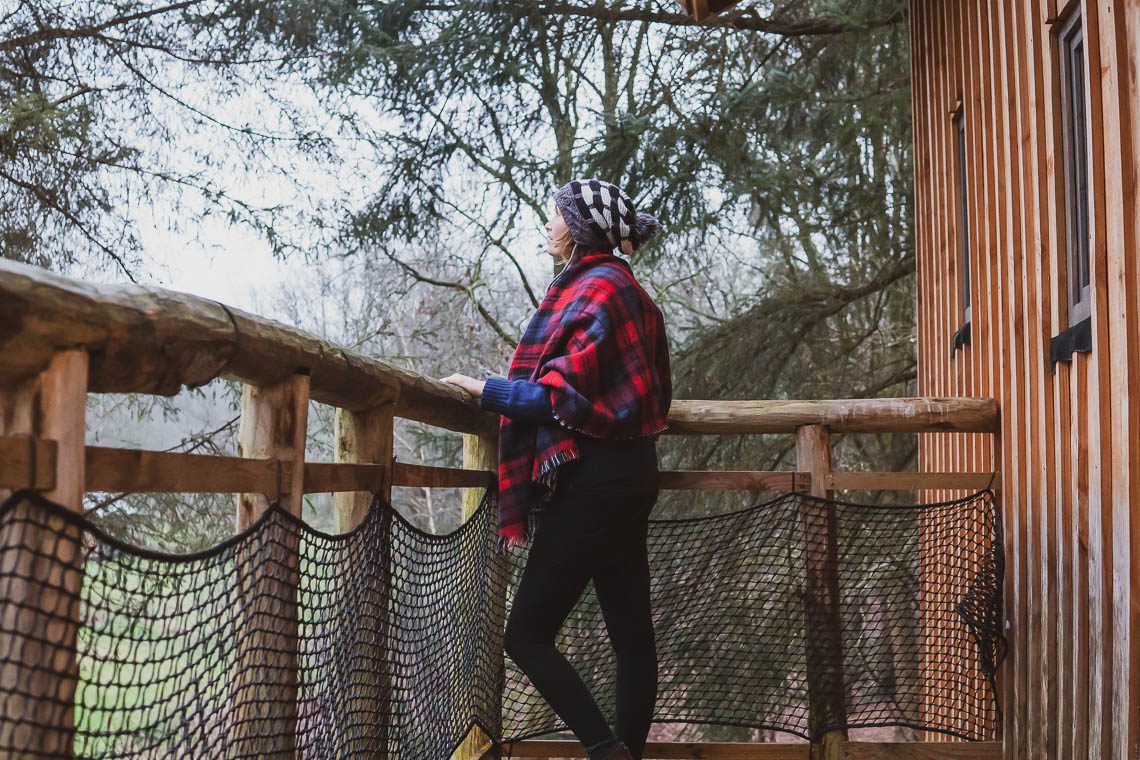 Bepackt mit Koffer und Rucksack steige ich langsam die knarzende Treppe empor, bis ich oben angekommen bin. Auf der Terrasse unseres Baumhauses. Mir wird ganz warm ums Herz, als ich unser Domizil fürs Wochenende in mich aufnehme. Durch eine hohe Fensterfront mit französischen Türen blicke ich hinein in unser Wohn- und Esszimmer mit Küchenzeile. Sowohl die Wände als auch ein Großteil der Möbel bestehen aus Holz und sorgen in Kombination mit den passenden, natürlichen Accessoires für eine heimelige Atmosphäre.