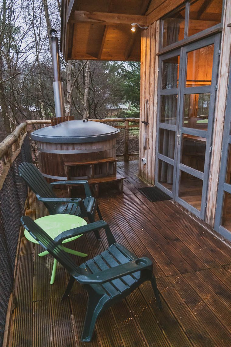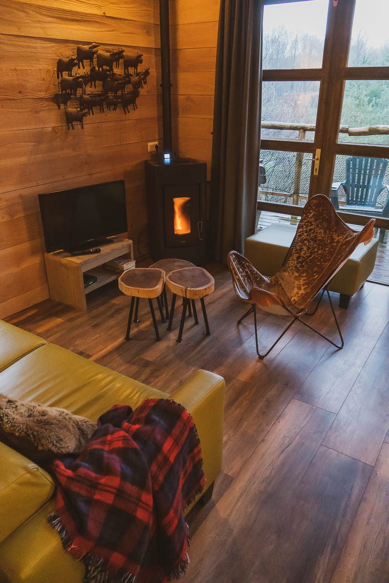 Der Name des Baumhauses “ ‘t Boswachters Huus” (das Försterhaus) könnte passender nicht sein, fühlt man sich doch ein wenig wie auf einem Hochsitz, von dem aus man auf Höhe der Baumwipfel die bewaldete Umgebung beobachtet. Auf der Terrasse des Baumhauses befindet sich nicht nur ein Picknicktisch, sondern auch bequeme Stühle und ein Hot Tub, eine holzbefeuerte heiße Wanne. Nachdem ich diesen Anblick ausgiebig in mich aufgesogen habe, trete ich in das bereits vorgewärmte Innere des Baumhauses. Durch die Isolierung und die Heizung – einer Kombination aus kleinen Heizkörpern und einem pelletbefeuerten Kamin – ist das Baumhaus auch in den Wintermonaten der perfekte Ort für ein paar Tage ganz im Einklang mit der Natur. Das Feuer prasselt bereits einladend im Kamin und ich mache mich auf Erkundungstour durch das Haus.