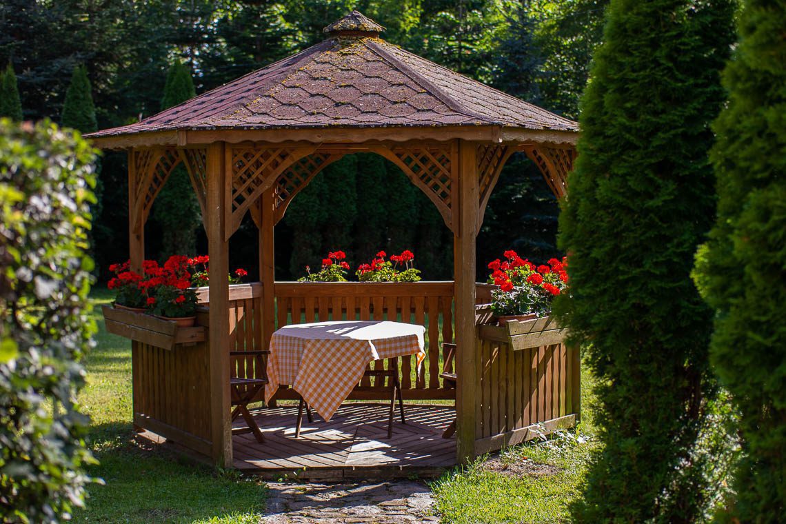 Wir wohnen abseits des Pilgerrummels in grüner, ruhiger Lage in einem gemütlichen Holzhäuschen am Gilwasee. Die Ferienresidenz Warminska-Gietrzwald besteht aus 32 Bungalows, die weitläufig über das Gelände verteilt sind. Freizeiteinrichtungen wie Swimmingpool, Sportfelder, Strandzugang und Bar gehören ebenfalls zum Gelände. Eine morgendliche Schwimmrunde im Pool oder See gehört hier genauso zum Tagesprogramm wie eine Bootsfahrt oder Fahrradtour in der wundervollen Umgebung.