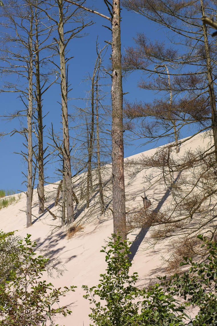 Die polnische Sahara werden sie auch genannt, die Dünen des Slowinski Nationalparks bei Leba. Und tatsächlich fühlt man sich ein wenig wie in der Wüste in Anbetracht der Größe und Weite des 18.000 Hektar großen Dünengebiets, welches übrigens seit 1977 zum UNESCO Weltreservat der Biosphäre zählt. Kurioserweise entstanden die bis zu 42 m hohen Dünen indirekt durch Menschenhand. Durch das Fällen eines großen Baumbestands entstand eine freie Fläche, die sich durch Sandverwehungen alsbald in eine Dünenlandschaft verwandelte. Zu einem richtigen Problem wurden die Dünen, die übrigens ganze 10 m (!) pro Jahr wandern, als sie im 16. Jahrhundert das Fischerdorf Leba einzuverleiben drohten. Das Dorf wurde kurzerhand ans andere Ufer des gleichnamigen Flusses verlagert, die Dünen wandern aber unvermindert in südöstliche Richtung. Die schiere Gewalt der Wanderung kann auch der Wald nicht aufhalten. Lebende Bäume verschwinden Stück für Stück unter den Sandmassen bis sie schließlich als total Baumstümpfe auf der anderen Seite wieder sichtbar werden. Eines Tages werden die Wanderdünen wohl den Lebsko-See verschlingen – oder er sie. Bis das soweit ist solltest Du die Chance nützen und die wunderschöne Panoramaaussicht von der 42 m hohen Lonske Düne (Łącka Góra) auf das Meer auf der einen und den Lebsko-See auf der anderen See genießen. Außerdem lohnt es sich Badesachen einzupacken, denn auf der Meerseite der Wanderdünen ist ein sehr schöner Strand.