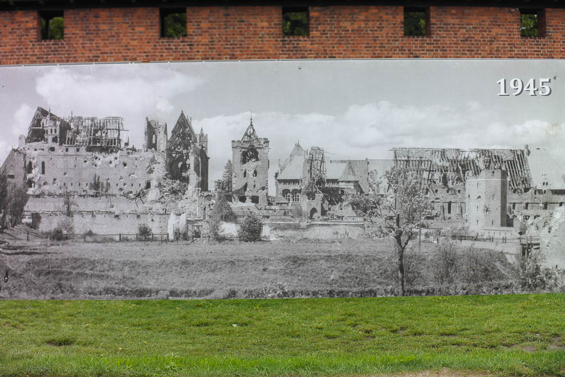 Diese blickt auf eine bewegte Geschichte zurück: Die Burg wurde ab 1270 als gotische Festung am Ufer des Flusses Nogat erbaut. Im Mittelalter war die Burg der Sitz des Hochmeisters des Deutschen Ordens und somit Zentrum des mächtigen preußischen Ordensstaates. Bereits im 15. Jahrhundert fiel die Burg an Polen. 1772 ging sie wieder an das Deutsche Reich zurück. 1920 wurde die Stadt samt Burganlage an den Regierungsbezirk Ostpreußen angeschlossen und konnte somit – ganz knapp – im Deutschen Reich verbleiben. Denn zwischen 1920 und 1939 diente die vor der Burg fließende Nogat als Grenze zwischen Ostpreußen bzw. dem Deutschen Reich und der freien Stadt Danzig. Während der Deutschen Besatzung von 1939 bis 1945 wurde die Burg westpreußisch bevor die rote Armee die Stadt samt Burganlage eroberte – wobei 60% der Burganlage zerstört wurde. Seither gehört die Marienburg endgültig zu Polen. Obwohl ein Großteil der Burg wieder originalgetreu wiederaufgebaut wurde, erinnert eine Leinwand und der nicht wiederaufgebaute Ostteil der Burg an den katastrophalen Zustand nach dem Weltkrieg.