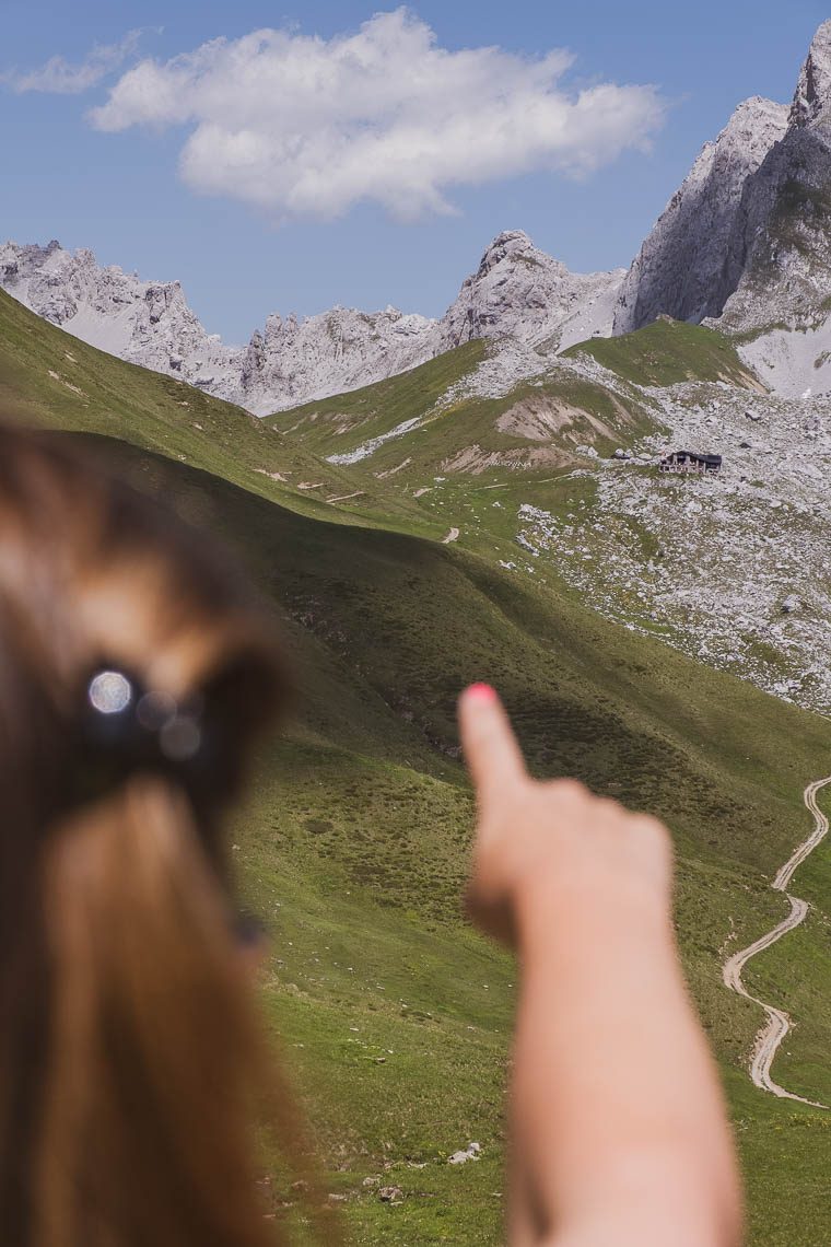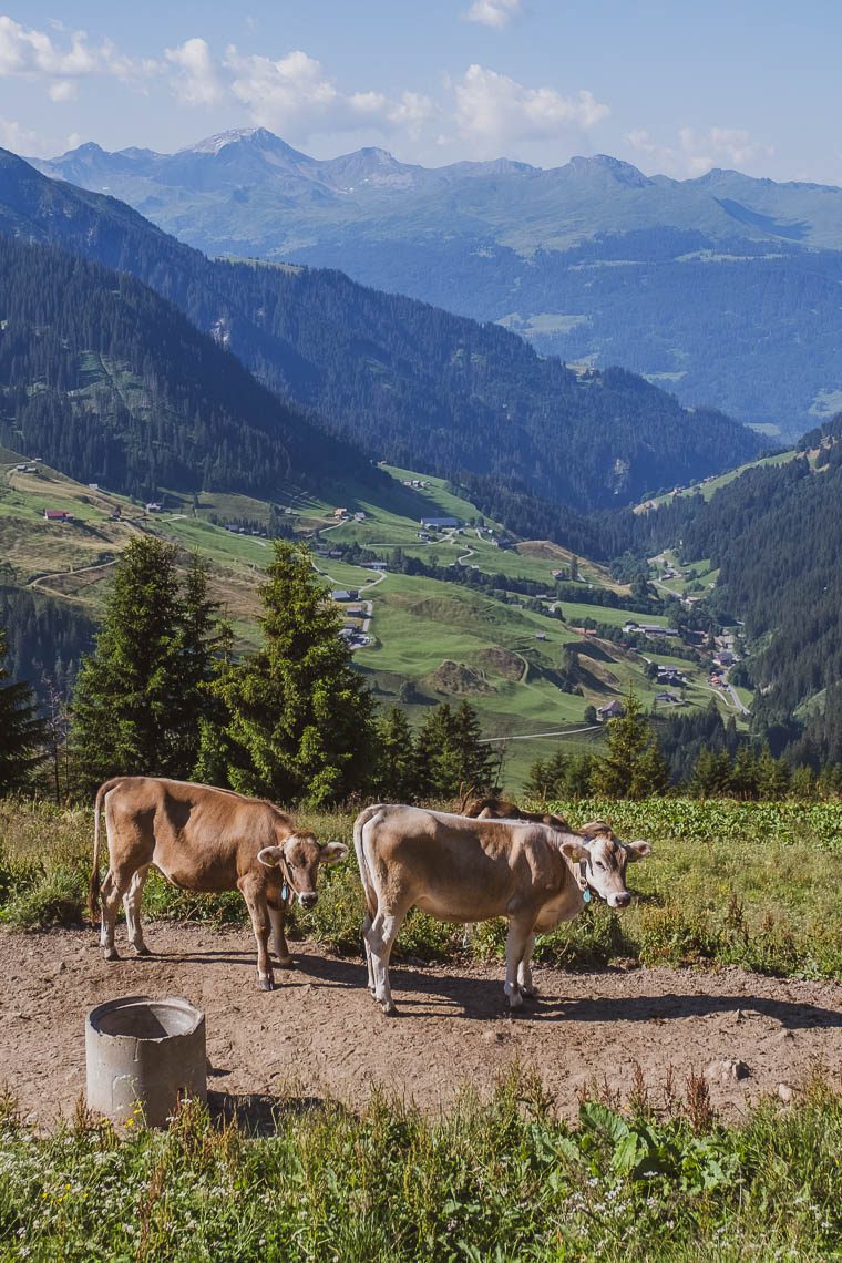 Als wir uns endlich von der Szenerie losreißen können, beginnt der “long way down” (830 Hm), wie wir es hinterher betrachten. Neugierig beäugt von schmatzenden Kühen bahnen wir uns unseren Weg stetig bergab, was durch die wunderbare Bergkulisse bedingt anfangs überhaupt keine Strafe ist. Längerfristig geht der Abstieg aber ganz schön in die Knie. In der Hitze lechzen wir nach einem kühlen Getränk, nur leider gibt es auch beim nächsten Getränkebrunnen kein Wechselgetränk und der Besitzer des Maiensäß, der mit Getränken wirbt, ist derzeit ausgeflogen.