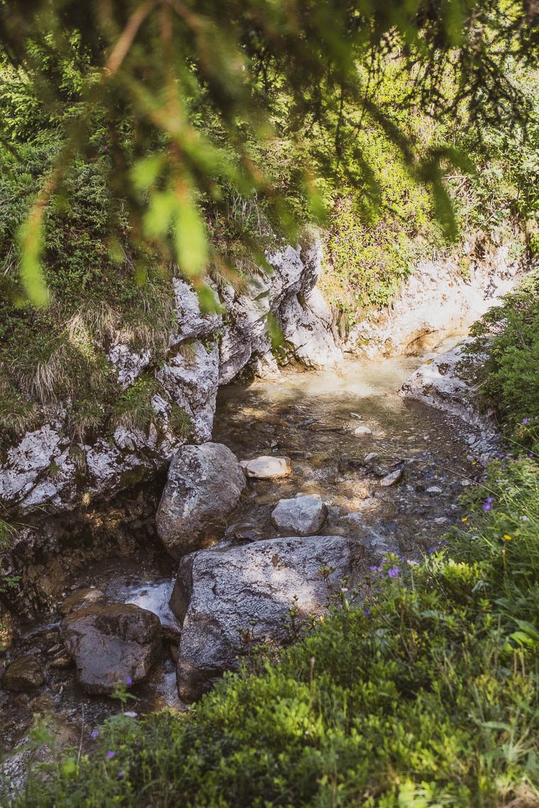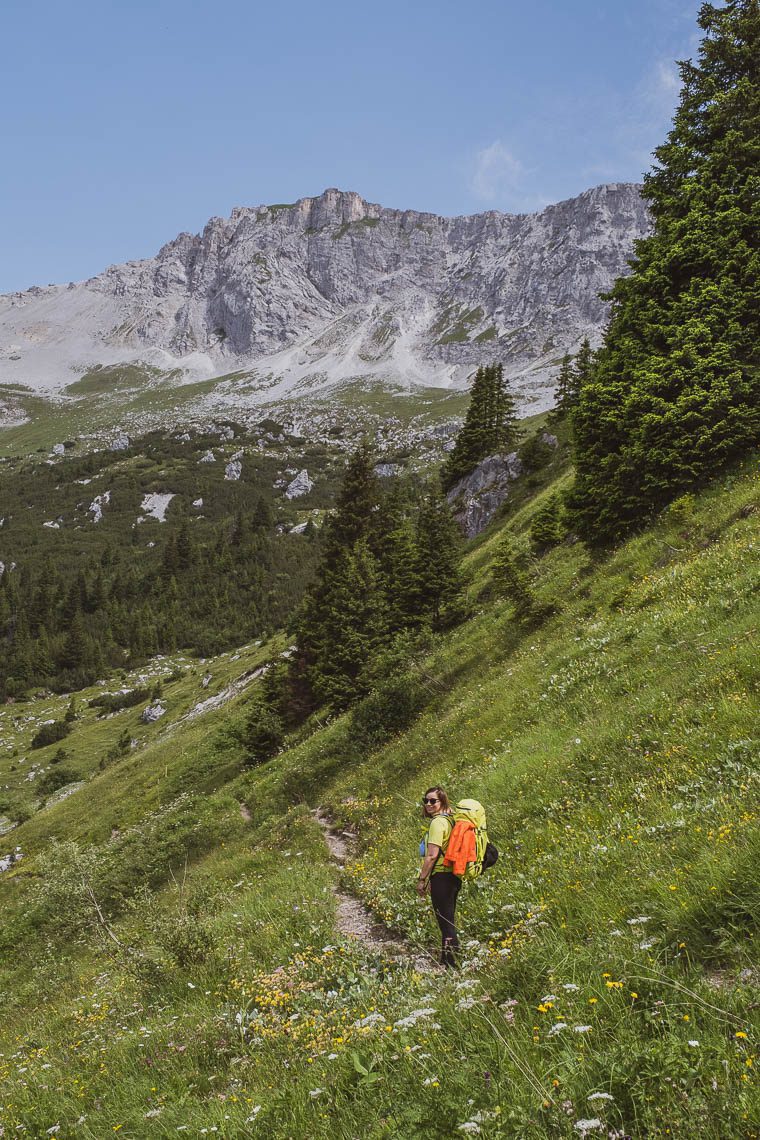 Ab dem Wendepunkt der Themenwanderungen begegnen wir nur noch vereinzelt anderen Menschen und schlängeln uns an der rechten Talflanke entlang, begleitet von den schönsten Weitblicken. In dieser Idylle und mit Aussicht auf die mächtigen Kalkwände zu unserer Rechten, gönnen wir uns die von der Unterkunft mitgegebene Brotzeit. Und diese schmeckt, wie immer in den Bergen, besonders lecker.