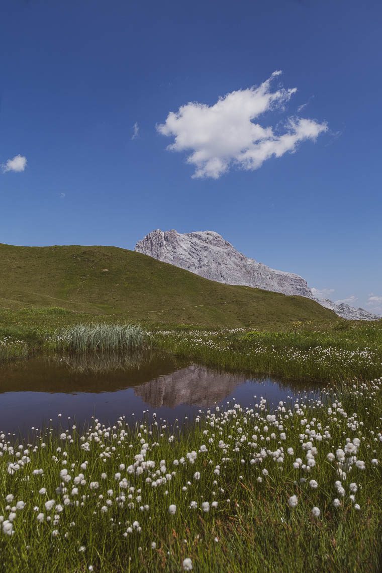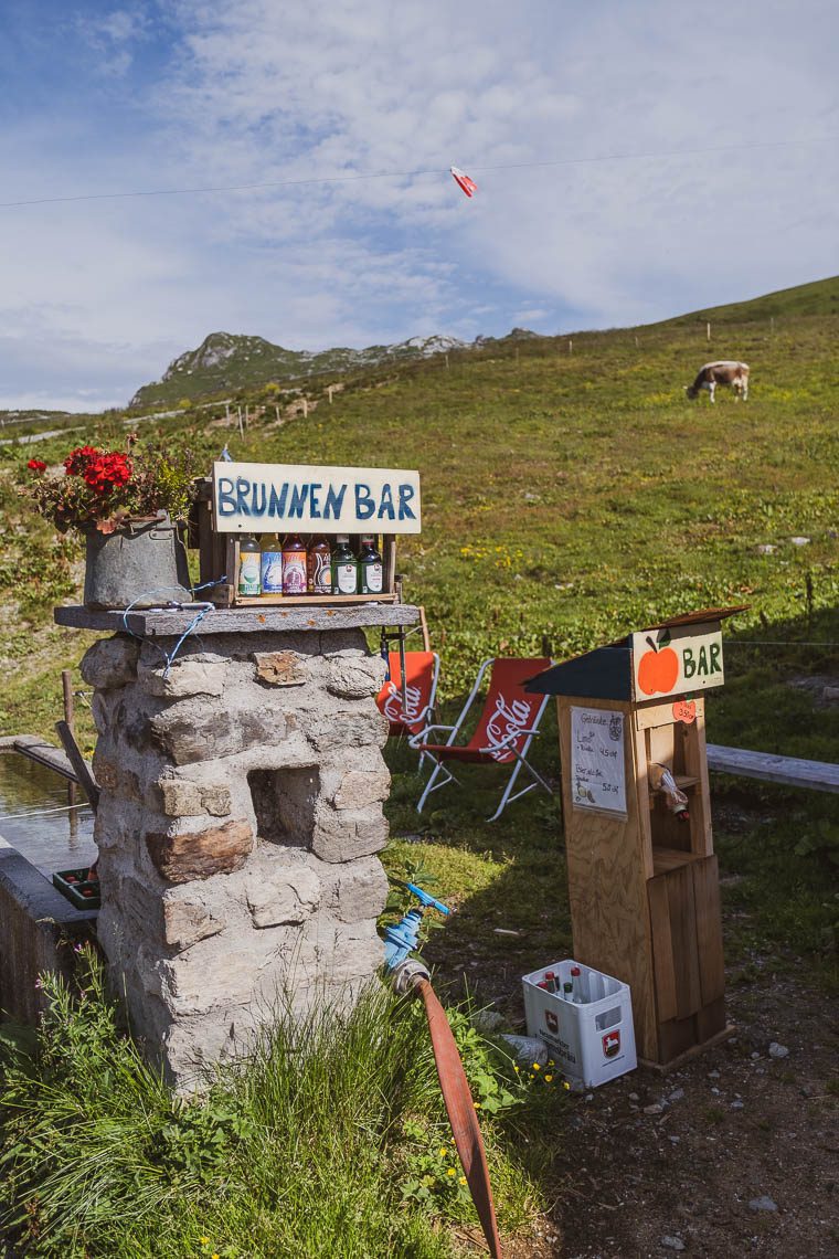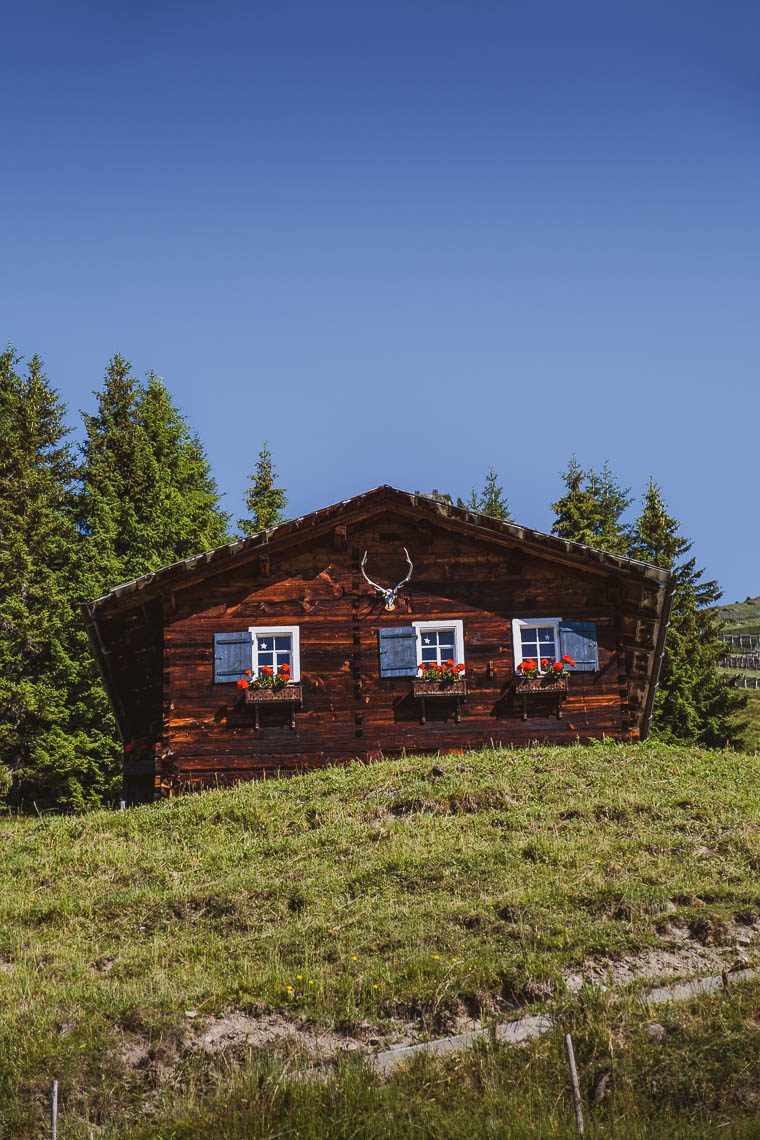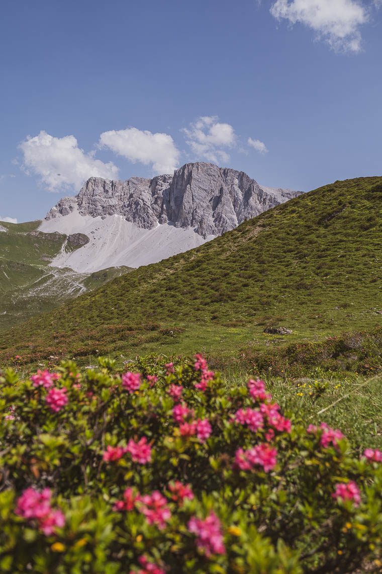 Wieder zurück in Klosters Dorf kann es endlich losgehen und wir überwinden die 600 Höhenmeter auf die Madrisa (1.887 m) in der Gondel der Madrisabahn in kürzester Zeit. Oben angekommen, lassen wir die Bergstation und die Erlebniswelt des Madrisa-Land, in welcher Familien sicherlich einen ganzen Tag verbringen können, hinter uns und folgen den grünen Schildern mit der Nummer 72 – dem Wegweiser des Prättigauer Höhenwegs. Mit seitlichen Talblick wandern wir durch summende Wildblumenwiesen während die Sonne vom strahlend blauen Himmel lacht. Schon nach wenigen Metern kommen wir an der Kuhalp Albeina mit einer Brunnenbar vorbei – die erste von einigen Getränkestationen auf unserer Tagesetappe.