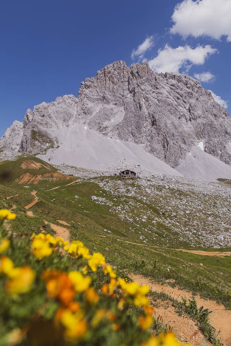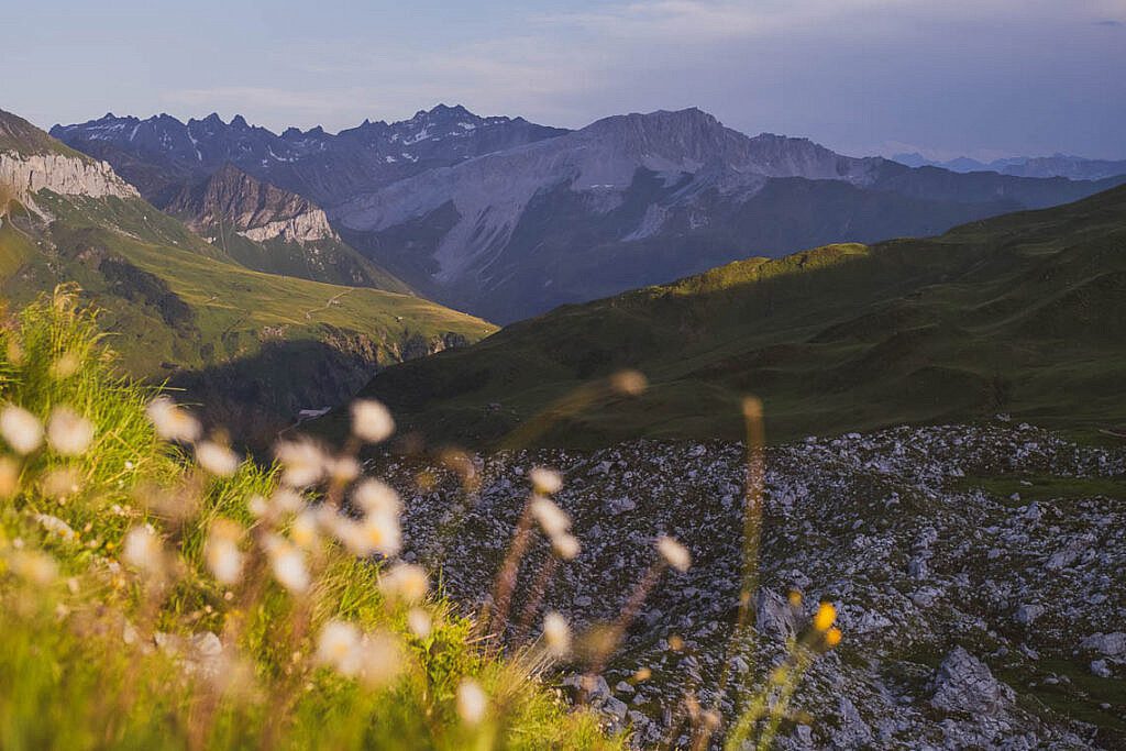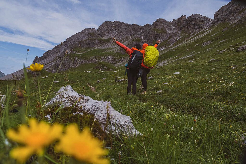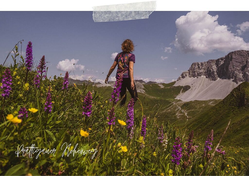 Ab dem Cavelljoch beginnt der entspannte Teil der Route, der durch die Tatsache, dass inzwischen der Regen aufgehört hat, noch angenehmer wird. Wir wandern stetig bergab am Fuß der Schesaplana (2.964 m) entlang während sich die Landschaft vor unseren Augen von kargen, schroffen Felsformationen zu lieblichen, blumenüberzogenen Almwiesen verwandelt.