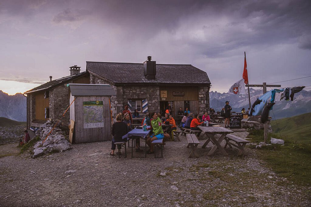 - Zweite Etappe: Übernachtung in der Carschinahütte im Lager (8-18 Personen). Einrichtungen: Gemeinschaftsbäder ohne Dusche, eine Mehrfachsteckdose zum Aufladen von Powerbanks/ Handys. Bewirtet zwischen Anfang Juni und Mitte Oktober, Winterraum für Selbstversorger vorhanden.