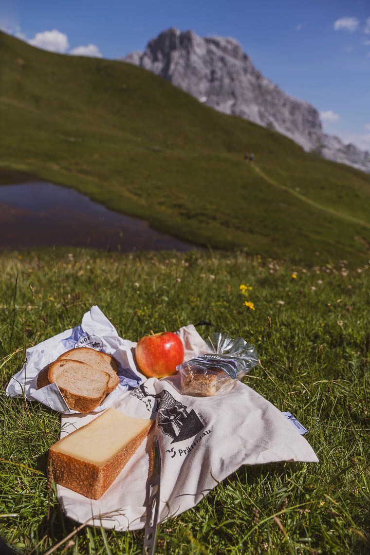 Als wir schließlich am Carschinasee ankommen, lassen wir uns ins Gras fallen und genießen im schönsten Sonnenschein eine ausgiebige Brotzeit mit Brot, Schweizer Käse, Apfel und einem Graubünder Nussgebäck mit dem ansprechenden Namen “Totenbeinli”. Dabei beobachten wie andere Wanderer und einige Familien mit dem am Steg liegenden Boot eine Runde auf dem See drehen. Manch einer wagt sich sogar ins kühle Nass des Sees.