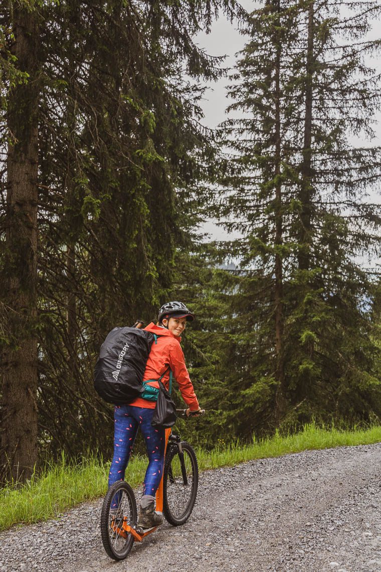 Kurze Zeit später machen wir mit einem richtig coolen Schweizer Phänomen Bekanntschaft: Dem Trottinett, liebevoll “Trotti” genannt. Einer Kreuzung zwischen Fahrrad und Roller, mit dem man schwungvoll den Berg hinab sausen kann. Mit den schweren Rucksäcken auf dem Rücken ist uns die Sache nicht ganz geheuer. Aus späterer Erfahrung kann ich sagen: Das geht problemlos. Unbedingt machen!