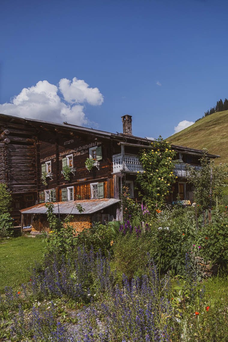Angekommen in St. Antönien finden wir Idylle pur – und nach einigen “geschlossen” Schildern auf der Terrasse des Haus Türli das, wonach wir uns schon so lange gesehnt haben: Ein kühles Getränk in Form eines erfrischenden Radlers (in der Schweiz: Panaché) und ein Stück frisch gebackene Donauwelle. Unser rettender Engel (so zumindest erfahren wir das in diesem Moment) ist die Deutsche Anke Sutter, die zuerst für den Job nach St. Antönien kam und der Liebe zu ihrem heutigen Mann Hanspeter wegen blieb. Heute führt sie mit viel Herzblut eine Pension mit vier Gästezimmern und bewirtet tagsüber auch vorbeikommende Wanderer wie uns.