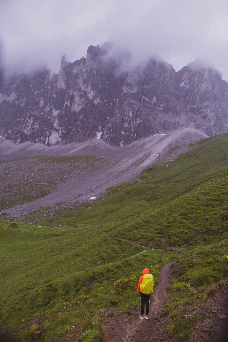Den schönsten Abschnitt des Prättigauer Höhenwegs sahen wir an diesem Tag hauptsächlich unter dem Rand unserer tief ins Gesicht gezogenen Kapuze hervor. Zudem blieb mit dem vorhergesagten Gewitter im Nacken und den nassen Witterungen leider kaum Zeit für Fotos. Denn trotz des miesen Wetters, wie wir es erwischten, erschloss sich uns die Schönheit dieser Tour. Bei Sonnenschein muss die Szenerie einfach umwerfend sein.