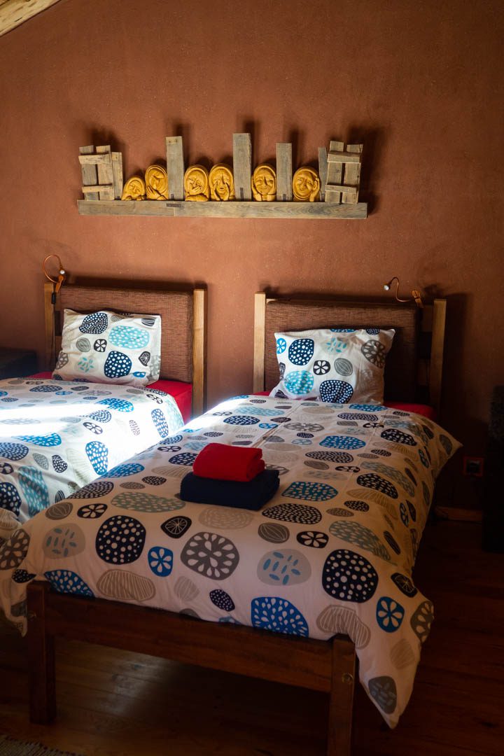 Bevor wir auf Erkundungstour aufbrechen, werden uns unsere Unterkünfte zugeteilt. Äußerlich entsprechen die Häuser dem früheren Erscheinungsbild, Innen jedoch wurde eine neue, moderne Einteilung gewählt. So befindet sich in meinem Häuschen unten ein Wohn- und Essbereich mit Küche, Sofa und Kamin und oben ein Schlafzimmer und ein Badezimmer. Aufgrund der guten, biologischen Bausubstanz halten die Häuschen im Sommer die Hitze draußen und im Winter die Wärme drinnen. So muss kaum geheizt werden. Falls man doch heizen möchte, so wird die Heizung durch Sonnen- und Windenergie gespeist. Das Wasser mit Trinkwasserqualität kommt aus der Quelle. Die Inneneinrichtung besteht beinahe komplett aus regionalen, natürlichen Materialien. Portugiesische Künstler – für jedes Häuschen ein anderer – durften den Unterkünften ihren Stempel aufdrücken.