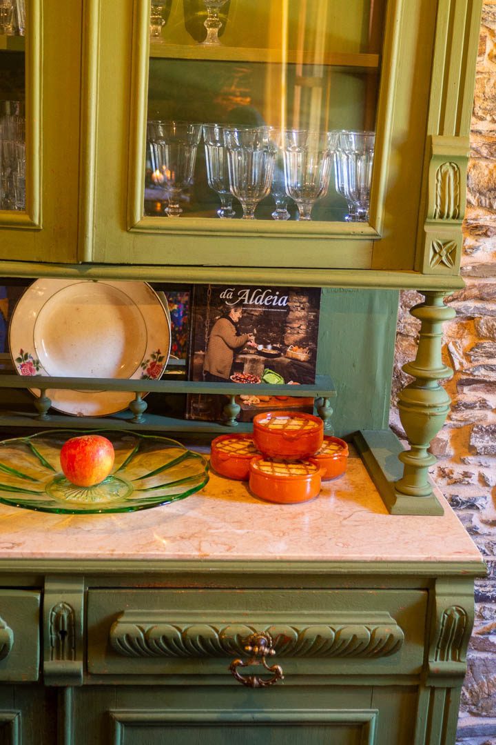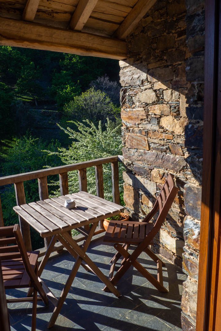 Auch Kerstin hat eines der Häuschen gestaltet, erzählt sie uns. “Casa das Vizinhas”, das Haus der Nachbarinnen hat sie es getauft und mit liebevoll von Holz geschnitzten rundgesichtigen alten Damen bestückt. Gutmütig und gewitzt blicken sie von den Wänden herab. Dabei handelt es sich um die Nachbarinnen, die sie gerne gehabt hätte, die aber zum Zeitpunkt ihrer Ankunft in Cerdeira nicht mehr dort waren, erklärt Kerstin. Eine schöne Idee, wie ich finde. Auch der Ausblick vom Balkon auf Teile des Dorfs und die Berge kann sich sehen lassen. Hier will man bleiben. Am liebsten länger.