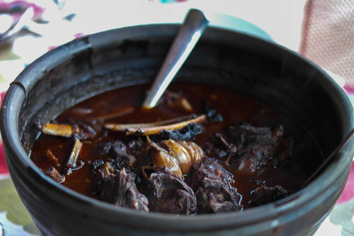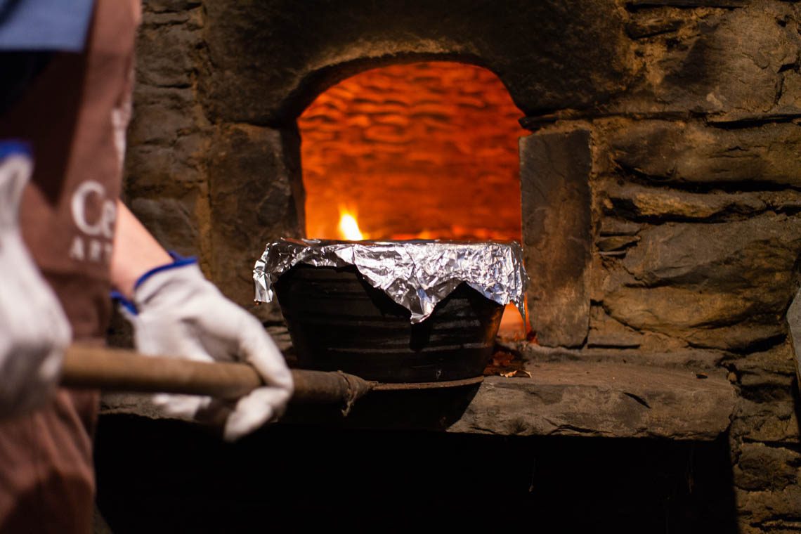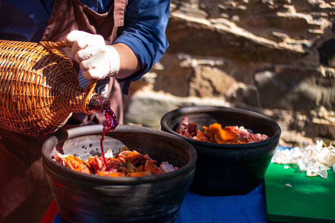 Als wir aus dem Café treten umfängt uns bereits der bekannte Geruch nach Holzfeuer. Kerstin hat bereits den traditionellen Steinofen des “Museums” angeheizt, ein kleines Schieferhäuschen, dessen Ausstattung der der früheren Häuser nachempfunden ist. Einfach, kalt und rauchig ist der erste Eindruck des Hauses, in dessen einzigem Zimmer sowohl gekocht, geschlafen und gelebt wurde. Das Feuer prasselt nicht grundlos im Ofen, denn wir lernen heute, wie man eine “Chanfana” (auf deutsch: “guter Braten”) zubereitet. Dabei handelt es sich um Ziegenfleisch, welches über Stunden in Rotwein und Gewürzen in einem Tontopf gegart wird. Dieses Gericht hat eine lange Tradition in der Region und wurde früher zu besonderen Anlässen aus dem Fleisch alter Ziegen zubereitet. Warum alter Ziegen? Ganz einfach, die jüngeren Ziegen waren zur Zucht, Verkauf und Milchgewinnung gedacht und zu wertvoll zum Verspeisen. Das Rezept ist denkbar einfach wie gut: Man nehme einen Tontopf, fülle ihn mit Fleisch und Knochen einer Ziege, gebe Knoblauch, Zwiebel, Salz, Pfeffer, Paprika, Lorbeerblatt und Piri-Piri hinzu und tränke das Ganze mit Rotwein. Dann muss das Ganze “nur” noch 4 Stunden im Holzofen schmoren.