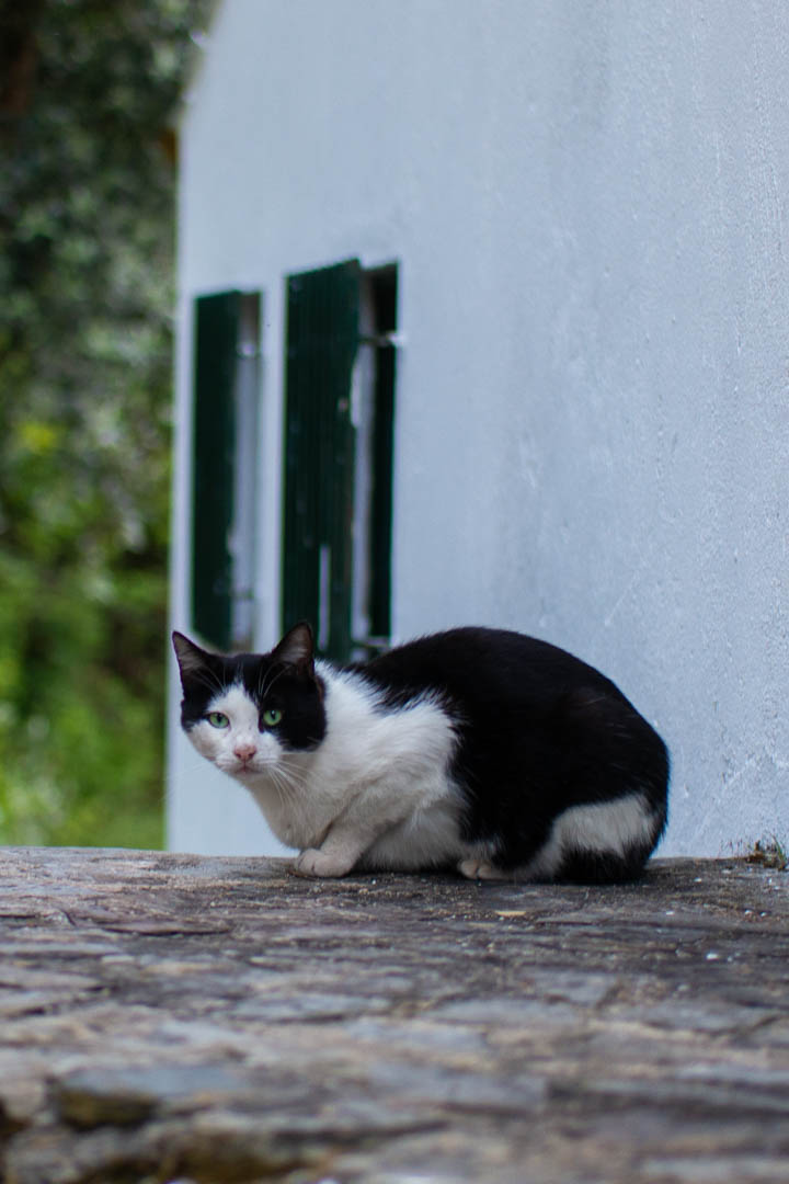 Nachdem wir die Chanfana im Holzofen verstaut haben, wartet bereits Ariana auf uns. Sie kennt Cerdeira seit ihren Kindertagen und antwortet auf die Frage, wie sie es empfindet, dort zu arbeiten, strahlend, es sei paradiesisch. Ich glaube ihr. Sie betreut eigentlich das Café in Cerdeira aber wenn nötig, springt sie auch für Wanderungen ein. Ihr Vater, erzählt sie stolz, ist leidenschaftlicher Wanderer und kennt die Gegend wie seine Westentasche. Sie wird uns heute zum nahegelegenen Schieferdorf Candal begleiten. Dabei wandeln wir auf – für Cerdeira – historischen Pfaden. Wir schlagen nämlich denselben Weg ein, den einst die Kinder von Cerdeira auf ihrem Weg zur Schule gingen. Treppab führt uns der Weg aus dem Dorf hinaus. Die Ruinen der Ziegenställe sind stummer Zeuge der Zeit, als die Einwohner von Cerdeira von der Zucht und dem Verkauf der 800 Ziegen, die sie hier hielten, lebten. Halb verfallen und wildromantisch von Pflanzen überwuchert liegen sie nun an unserem Wegesrand. Bienen summen von Blümchen zu Blümchen. Ariane erzählt uns, dass sich die Hänge rund um Cerdeira im Sommer zur Heideblüte in leuchtendem Violett färben. Ein wahres Bienenparadies und der Grund dafür, warum der dunkle Heidehonig so typisch für diese Region ist. Wir hüpfen über die Steine im Flussbett und folgen dem Weg bergauf, bis schließlich Candal, ein weiteres Schieferdorf Mittelportugals, vor uns liegt. Was uns direkt auffällt: Während in Cerdeira alle Häuser mit denselben Materialien und Techniken gebaut sind, gleicht hier kaum ein Haus dem anderen. Dies liegt daran, erklärt Ariana, dass das Dorf an einer Durchgangsstraße liegt und daher nie komplett verlassen wurde. Die verschiedenen Besitzer haben im Lauf der Jahre ihre Häuser nach ihrem Geschmack und Budget gestaltet bzw. erneuert. Nichtsdestotrotz ist Candal ein hübsches Dorf, mit blumenüberrankten Eingängen und Charme. Wir lassen uns im Restaurant Sabores nieder, in dem Anna den Kochlöffel schwingt. Gelernte Köchin ist sie nicht, lacht sie, nur eine Mutter, die jetzt für Gäste kocht. Und so fühlt es sich auch an in ihrer Gaststube. Wie bei Muttern zu Hause. Munter füllt sie unseren Tisch mit geschmortem Fleisch, Kartoffeln, Broccoli und Brot. Im Anschluss probieren wir uns noch durch die Nachspeisen, mein Favorit ist der süße Milchreis mit eingelegter Birne. Ein Traum!