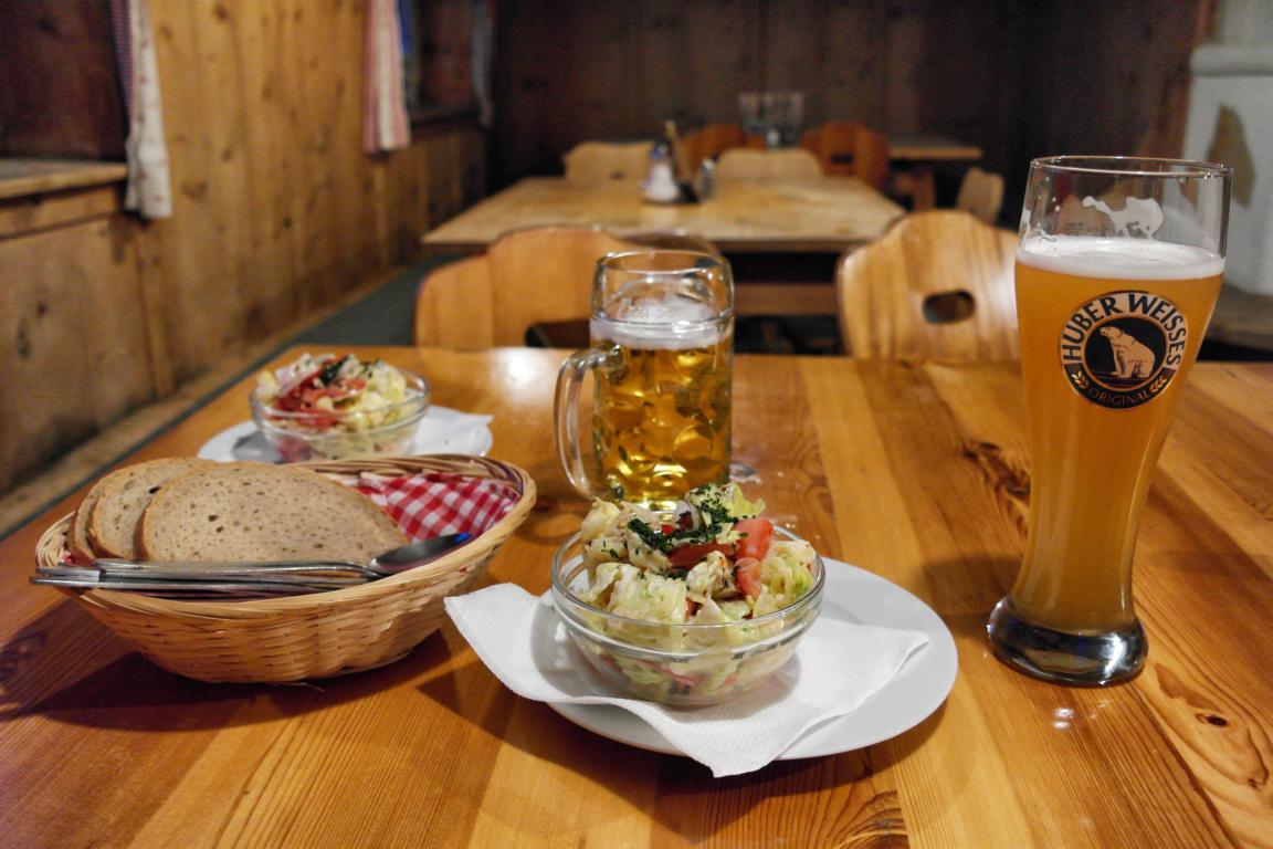 Wenige Meter weiter begrüßt uns die Kögele Hütte auf 1.514 m, in deren urigen Gaststube ein prasselndes Kaminfeuer Behaglichkeit verbreitet. Da das Tagesgeschäft bereits vorbei ist sind wir die einzigen Gäste. Zufrieden seufzend lassen wir uns auf die Eckbank sinken und lassen den Tag bei einem frisch gezapften Bier Revue passieren. Nachdem wir unser Nachtlager im Schlafsaal im Obergeschoss bezogen haben und die Wanderstiefel gegen Hausschlappen eingetauscht haben wird das Abendessen serviert. Zur Vorspeise wird ein grüner Salat, Kartoffelsuppe und Brot serviert. Die Hauptspeise besteht aus Fleischkäse auf Röstkartoffeln mit Spiegelei – lecker aber so üppig, dass ich die Nachspeise, gemischtes Eis, stehen lasse. Hinterher sitzen wir wohl gesättigt noch eine Weile zusammen und lauschen Christians Geschichten über die Berge und seinen abwechslungsreichen Alltag als Bergführer, Mountainbike- und Schneeschuhguide sowie Skilehrer bevor wir in unser wunderbar kuscheliges Nachtlager fallen.