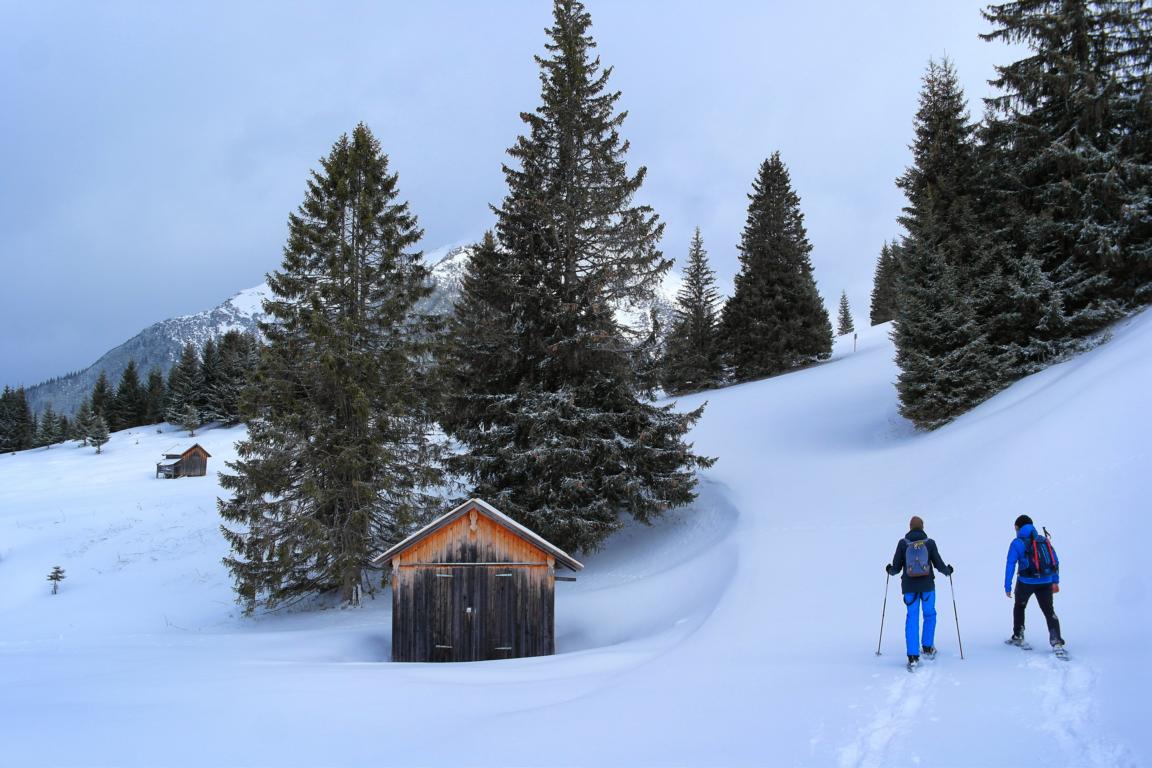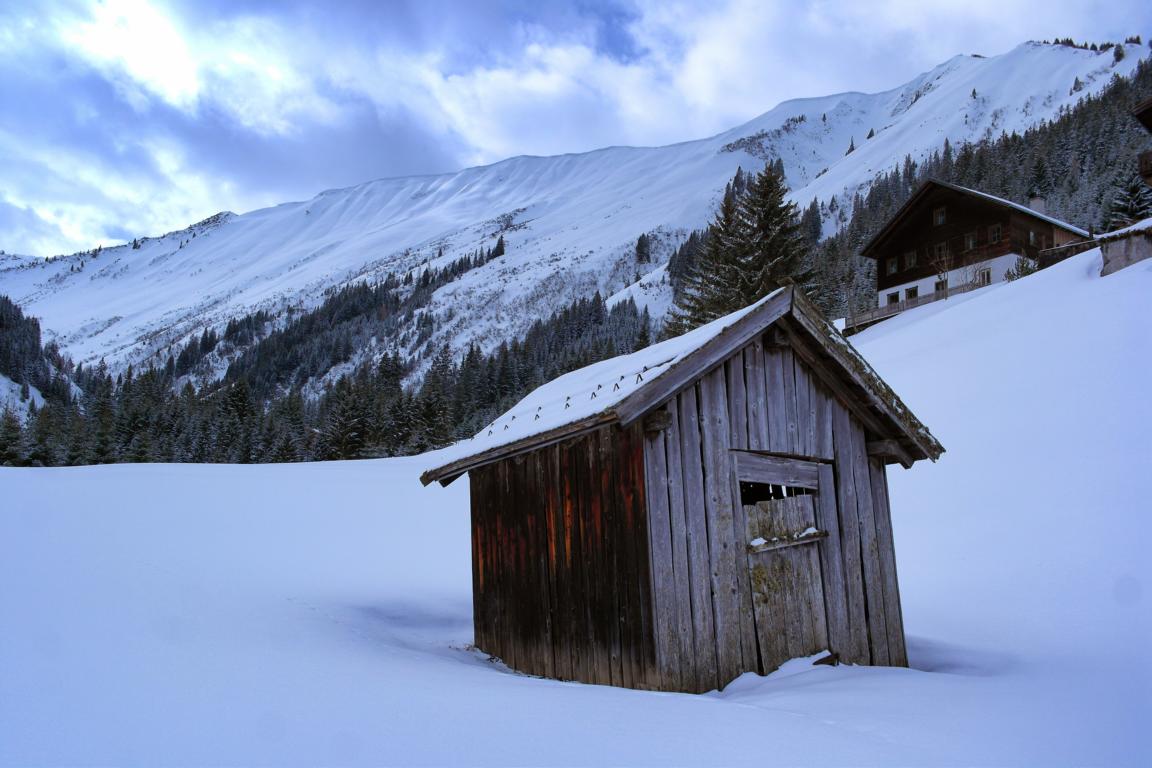 Geschichten austauschend machen wir uns auf den Rückweg nach Berwang und nutzen Christians Auto für eine kurze Fahrt in Richtung “Ende der Welt” (kein Scherz). Von dort aus geht es hinauf zur Kögele Hütte, unserem heutigen Nachtlager. Nach einem knackigen Aufstieg finden wir uns auf einer sanft geschwungenen Alm wieder, welche übersät von kleinen Stadeln (Scheunen) ein äußerst idyllisches Bild abgibt. Der Schnee knirscht unter unseren Schneeschuhen, ansonsten umgibt uns vollkommene Einsamkeit und Stille.